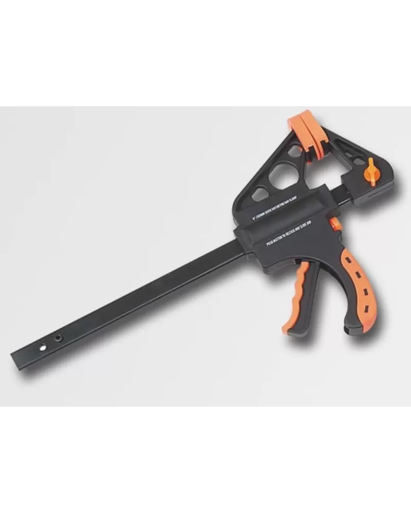 Jednoruční svěrka, utahování pomocí páky. Povolení odjišťovacím tlačítkem. Plastové koncovky proti pošození materiálu.