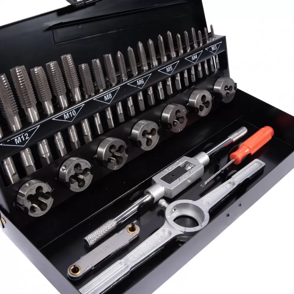 • Sada z nástrojové oceli na řezání vnitřních a vnějších závitů, měrka pro měření metrických závitů.