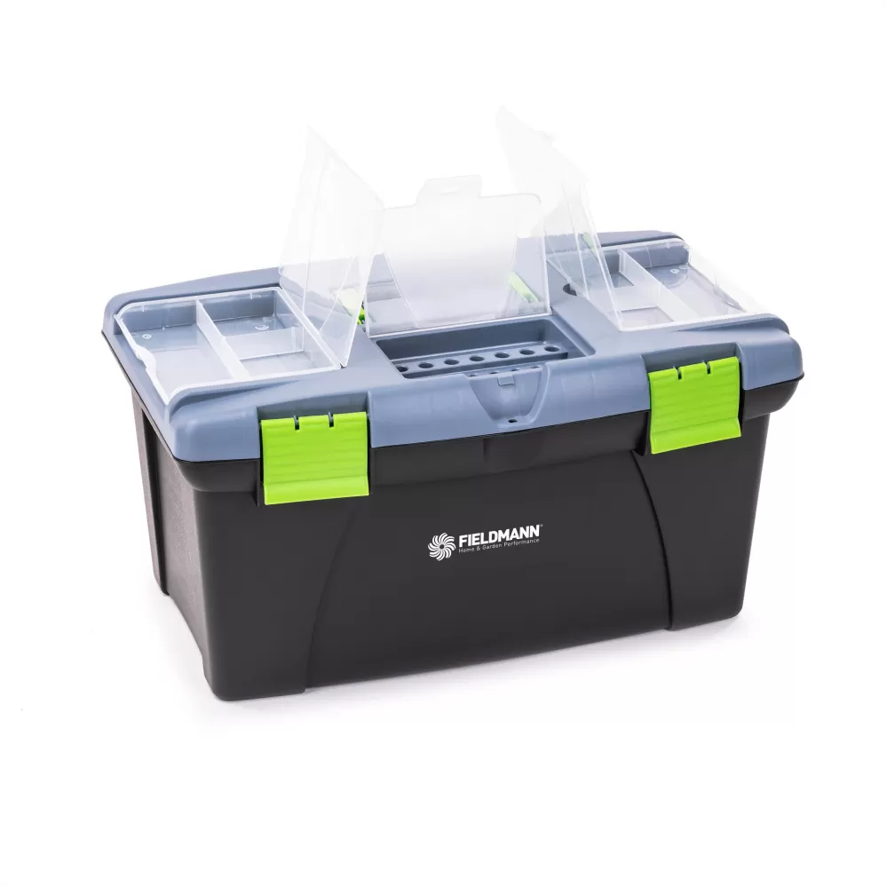 S rozměry 500 × 300 × 280 mm nabízí box Fieldmann dostatek prostoru pro všechny potřebné nástroje a zajistí jejich bezpečné uskladnění. Díky ergonomicky tvarované rukojeti box snadno přenesete, zatímco robustní plastové zámky zajistí bezpečné uložení obsahu, abyste měli své náčiní vždy připravené k akci.