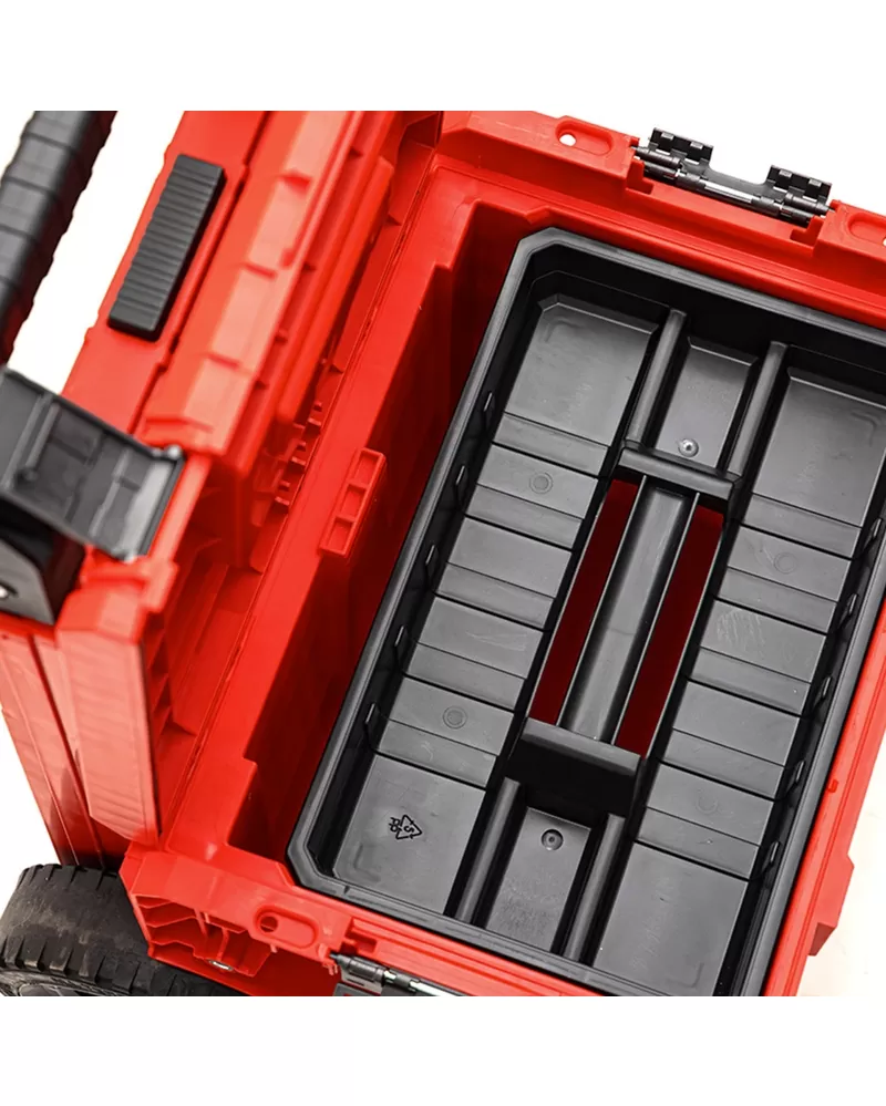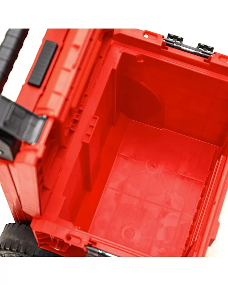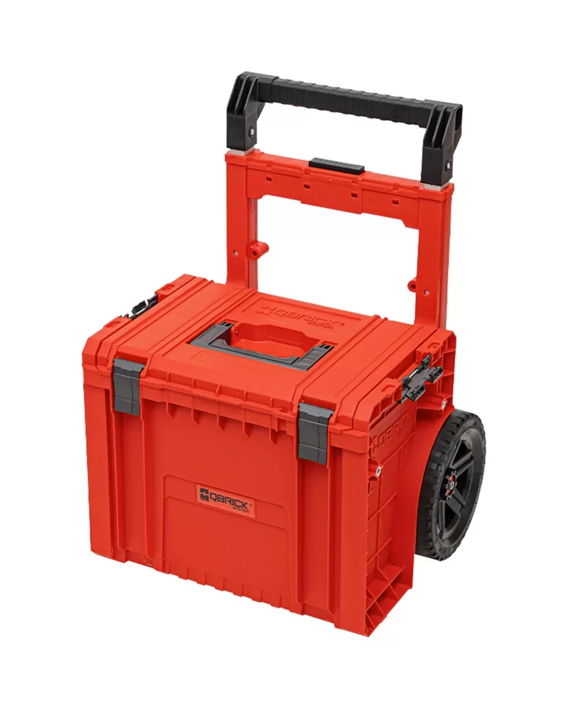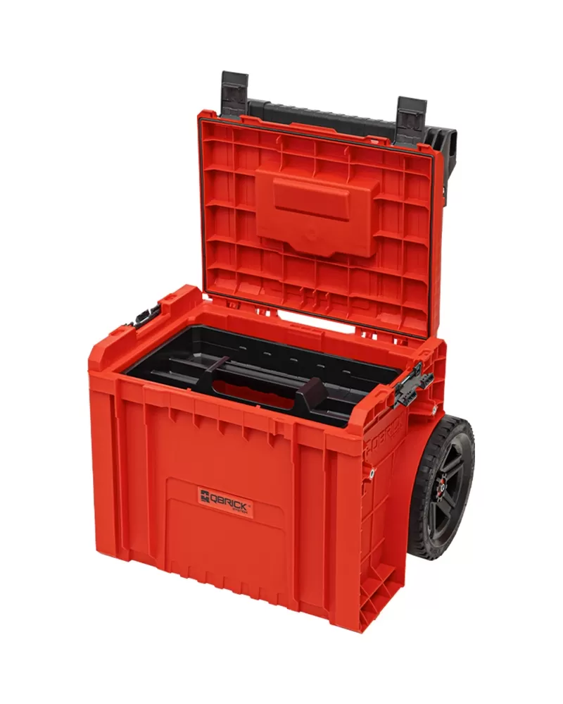 Praktický přepravní box na kolečkách navržený pro profesionální použití. Disponuje odnímatelnou teleskopickou rukojetí ve dvojitém provedení a integrovanou opěrkou pro nohu, což umožňuje stabilní držení a snadné ovládání i na omezeném prostoru. Devítipalcová kola o šířce téměř 6 cm jsou opatřena silnou gumovou vrstvou, která zaručuje spolehlivý pohyb i v náročném terénu. Robustní zámky a boční spojovací prvky z vysoce odolného polyamidu přispívají k bezpečné přepravě nářadí. Celá konstrukce je navržena tak, aby odolávala prachu i vodě, díky pružnému těsnění integrovanému ve víku.