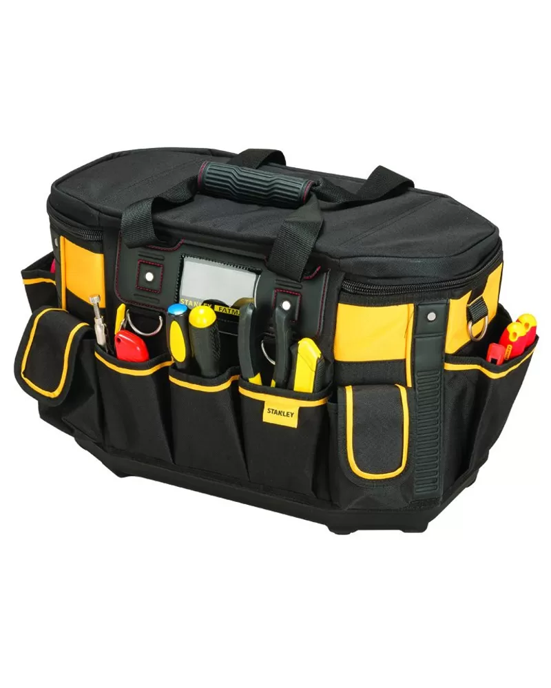 Pevná brašna na nářadí s oválným víkem Stanley FatMax FMST1-70749 s velkým úložným prostorem, ergonomickým designem a popruhem přes rameno.