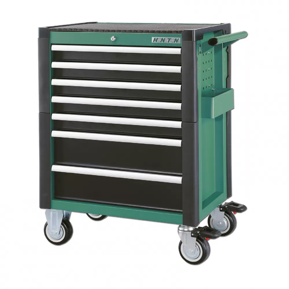 Kovový montážní vozík na nářadí se 7 zásuvkami. Dvě pevná a dvě otočná kola s poziční brzdou. Zásuvky s kuličkovými ložisky lze vysunout do 40 cm. Horní pracovní plocha i zásuvky jsou vypodloženy protiskluzovou podložkou. Držadlo pro manipulaci s vozíkem lze umístit z pravé i levé strany. Součástí je 5 nízkých a 2 vysoké uzamykatelné zásuvky.
