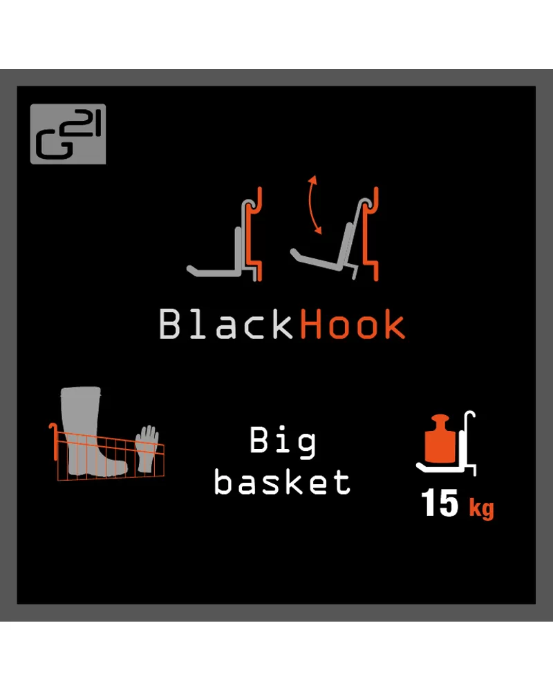 • Košík na nářadí G21 BlackHook big basket vám umožní bezpečné uložení sportovního vybavení, zahradnického nářadí a dalšího náčiní, např. čisticích prostředků, tenisových míčků, kladiv, apod.