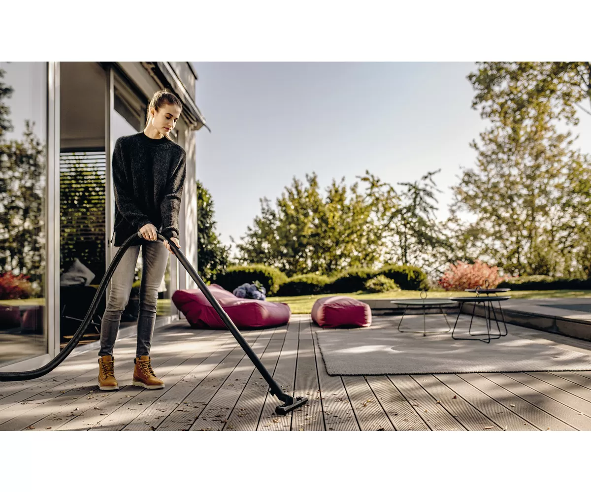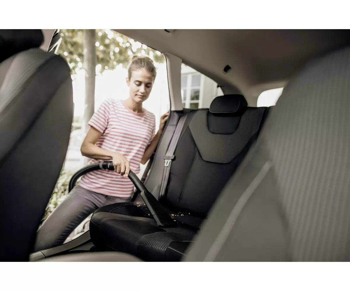• Stroj zaujme hubicí do auta, extra dlouhou štěrbinovou hubicí a sacím kartáčem s měkkými a tvrdými štětinami. Ať už se jedná o citlivé povrchy, jako je palubní deska, silně znečištěná místa, jako je prostor pro nohy, velké plochy v zavazadlovém prostoru nebo úzké prostory mezi sedadly: Díky speciálním kartáčům a hubicím lze bez problémů důkladně vyčistit každou oblast uvnitř vozidla. Odnímatelná rukojeť umožňuje připojení kartáčů a hubic přímo k sací hadici a umožňuje tak práci ve stísněných prostorách bez námahy. Vybavena robustní a nárazuvzdornou nádobou z nerezové oceli o objemu 17 l, 6 m kabelem a 2 m sací hadicí s odnímatelnou rukojetí, podlahovou hubicí Clips, štěrbinovou hubicí, kartušovým filtrem a fleecovým filtračním sáčkem. Jednodílný kartušový filtr umožňuje vysávání suchých i mokrých nečistot bez výměny filtru. Další vlastnosti: možnost uložení na hlavě stroje, praktická funkce foukání, uzamykací systém "Pull & Push" pro jednoduché otevírání a zavírání nádoby a ergonomicky tvarované madlo pro přenášení.
