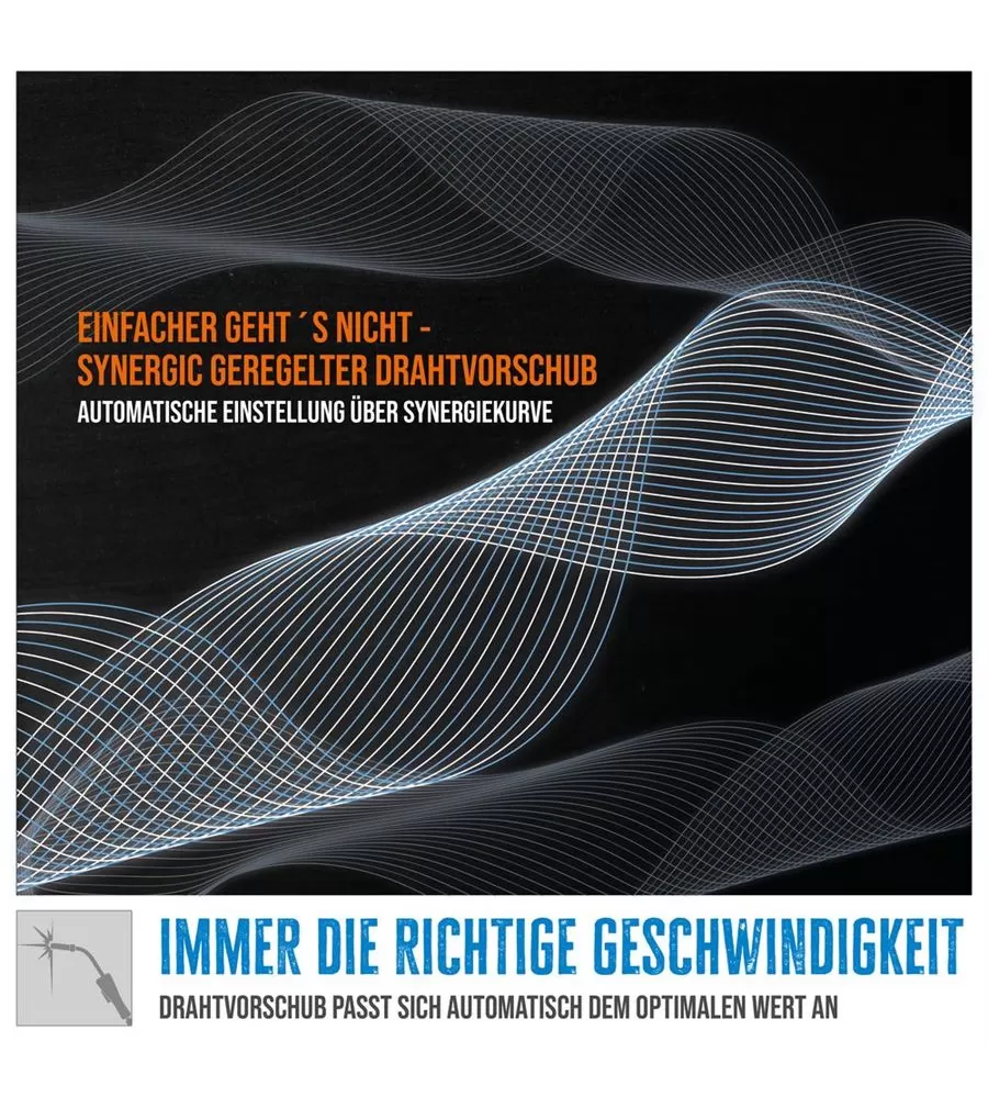 • Funkce A-SYNERGIC, automaticky upravující svářecí proud, napětí a rychlost posuvu drátové elektrody podle tloušťky materiálu