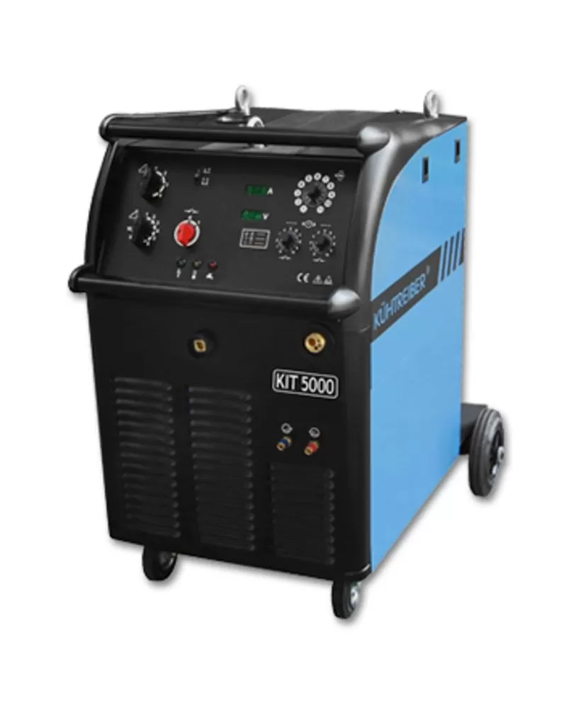 Moderný a profesionálny zvárací stroj MIG/MAG z novej série KIT 5000W Standard. Hlavnými výhodami štandardných stojanov KIT 5000W sú vynikajúce zváracie vlastnosti, jednoduchá obsluha, 40-stupňová regulácia zváracieho prúdu, integrované vodné chladenie zváracieho horáka a predovšetkým spoľahlivosť. Zváračka KIT 5000W Standart je zástupcom nových zváračiek určených nielen do zámočníckych dielní, ale aj do kovoobrábacích dielní a závodov ťažkého priemyslu. KIT 5000W nadväzuje na úspešný starší model KIT 500W Standard. Štandard KIT 5000W je vybavený úplne novým kombinovaným transformátorom CU/AL (primárne vinutie Cu a sekundárne Al), novým výkonným chladiacim ventilátorom, masívnym 4-kladkovým podávačom zváracieho drôtu (kovové prevedenie), výkonným motorom podávania drôtu, EURO konektorom a nosičom cievky zváracieho drôtu umožňujúcim vloženie cievky 5 až 18 kg. KIT 5000W Standart umožňuje pripojenie redukčného ventilu Co2 s predohrevom 42 V.