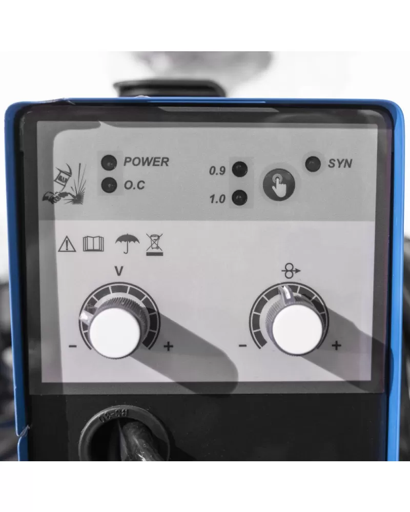 Invertorová svářečka pro svařování trubičkovým drátem do tloušťky 0,9 mm (malá cívka). Plášť z ocelového plechu s práškovým nástřikem.