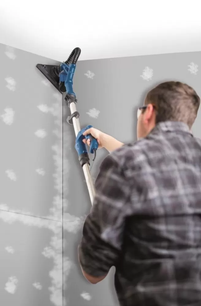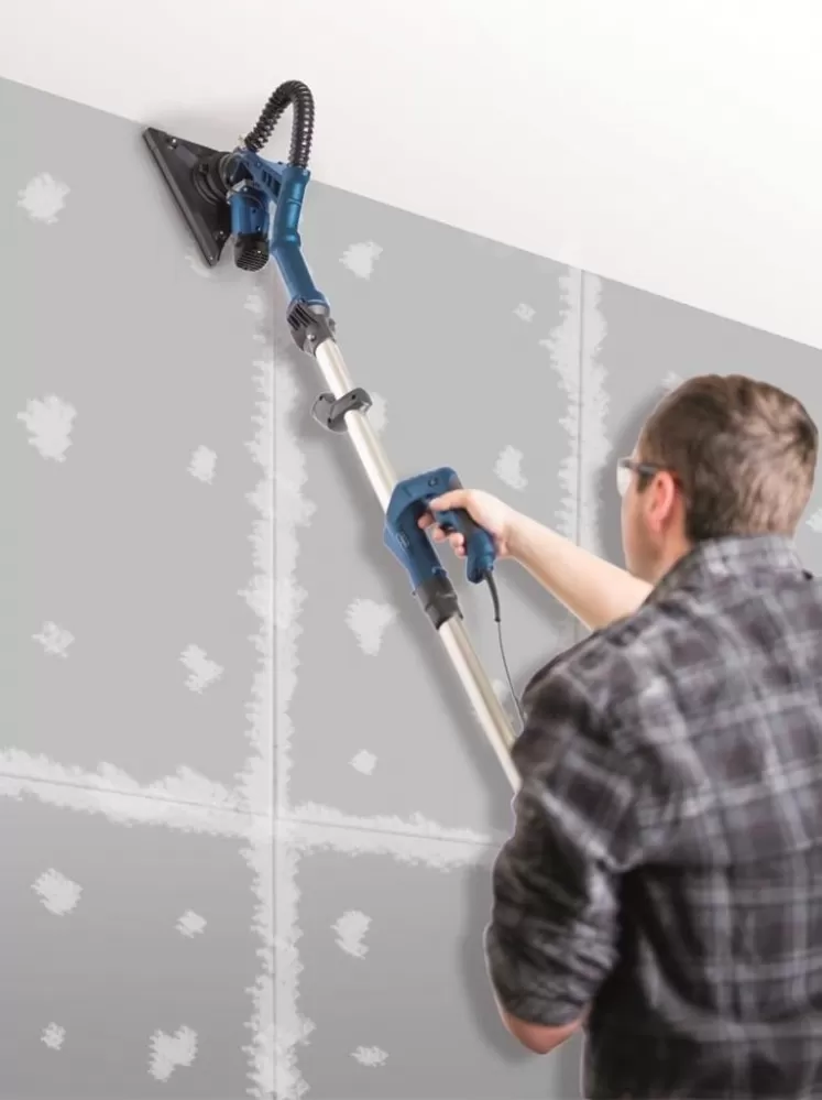 • Abyste dosáhli až ke stropu nebo do špatně přístupných míst, je bruska vybavena výkyvnou hlavou, prodlužovací teleskopickou rukojetí, díky které se dá délka stroje nastavit v rozmezí od 140 do 165 cm a další trojúhelníkovou hlavou, která je ideální pro práci u stěn a v rozích
