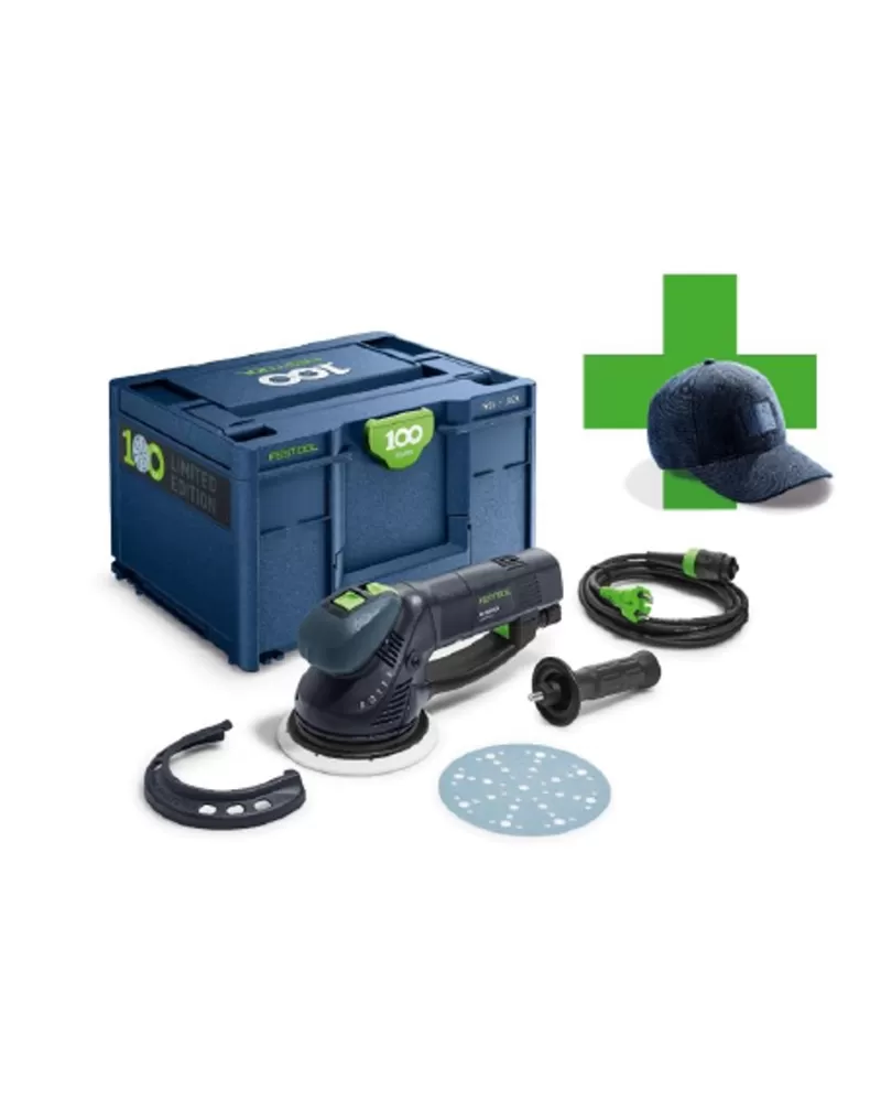 Limitované edice excentrické brusky ROTEX RO 150 v modrém Systaineru3 a s čepicí 100 let zdarma.