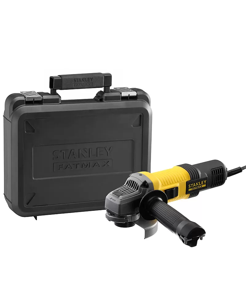 Úhlová bruska 115mm Stanley FatMax FMEG210K s motorem o příkonu 850 W a  vypínačem s ochranou proti nechtěnému opětovnému zapnutí stroje po výpadku elektřiny.