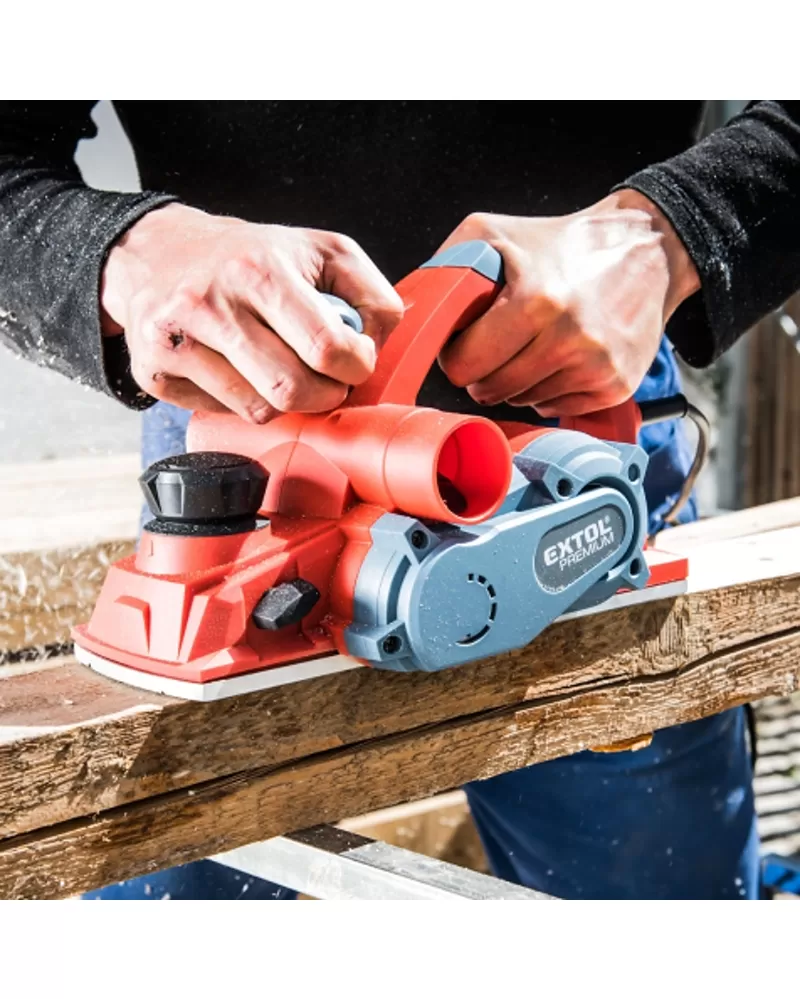Elektrický hoblík EXTOL PREMIUM 8893405 je velmi silný hoblík s hoblovací šířkou 110mm, určen k hoblování, srážení a drážkování dřeva, např. trámů a prken.
