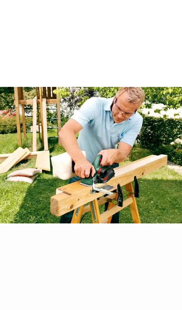 • Automaticky sklopná ochranná pätka – zabraňuje poškodeniu obrobku alebo hobľovacieho noža pri odložení hoblíka