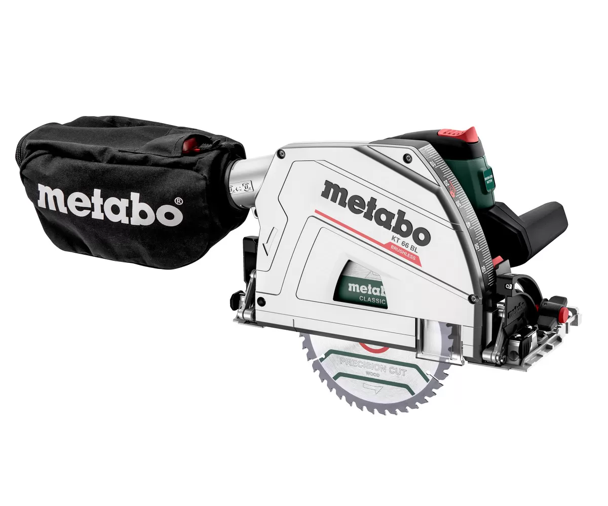 Ruční okružní pila Metabo KT 66 BL 601166000 Ponorná kotoučová pila s bezuhlíkovým motorem pro efektivní zanoření a přesné řezy do hloubky až 66 mm Nastavitelné usazení bez vůle na vodicích lištách od Metabo a jiných výrobců pro přesné...
