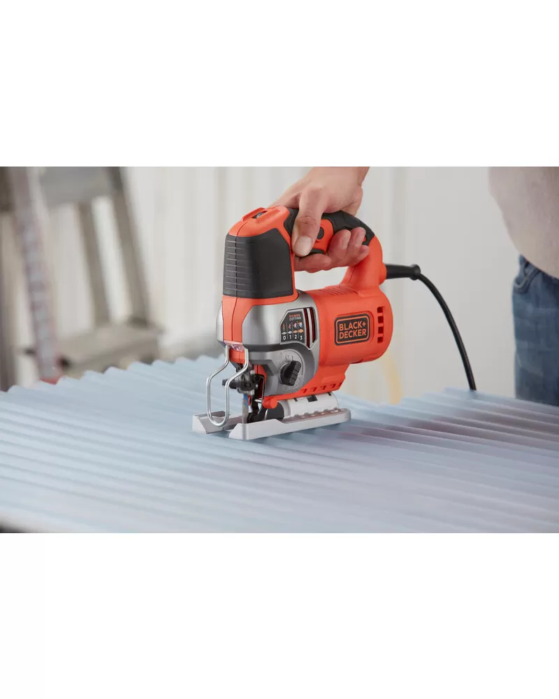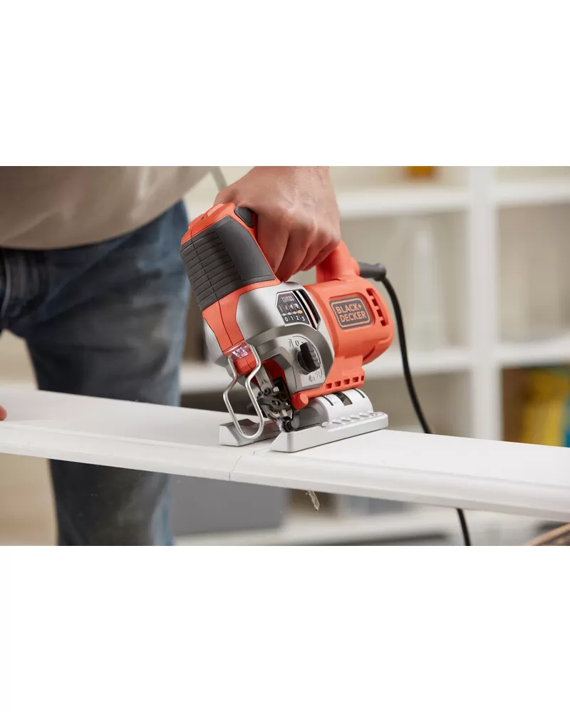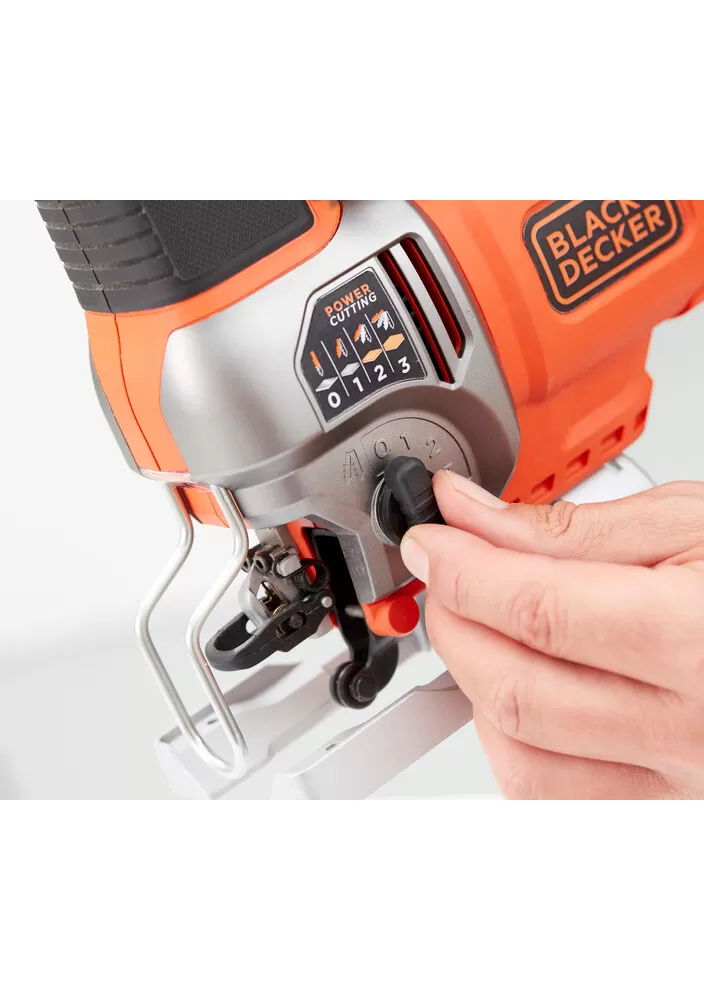 Přímočará pila Black&Decker BES610K s jednoduše nastavitelným počtem zdvihů pomocí ergonomicky umístěného palcového kola pro ideální výkon při rovných, zakřivených a pokosových řezech.