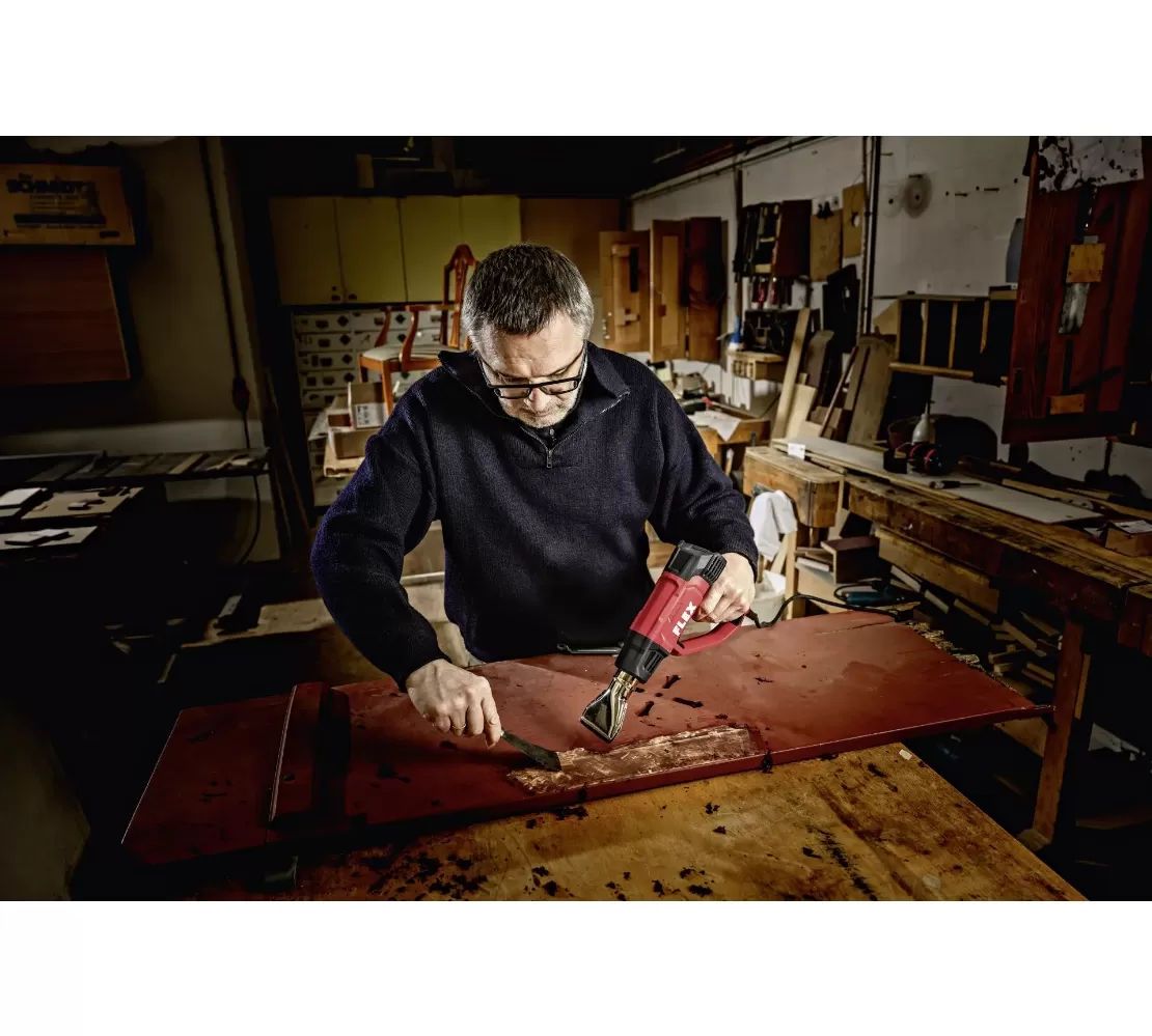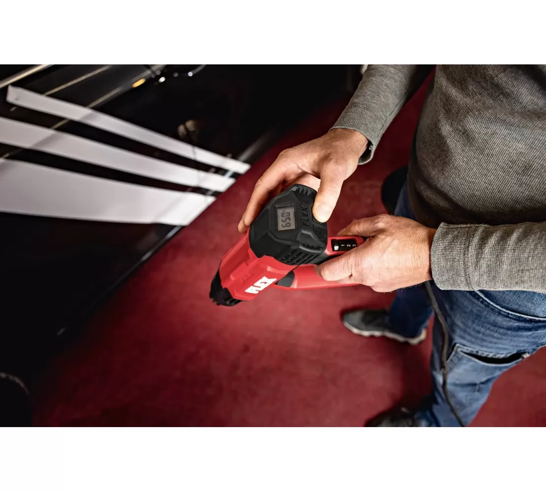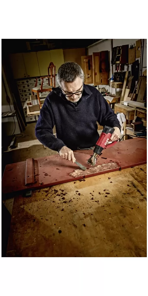 • Výkonná horkovzdušná pistole s regulací teploty v krocích po 10° v pásmu 50°-650°C a 2 nastavení proudění vzduchu