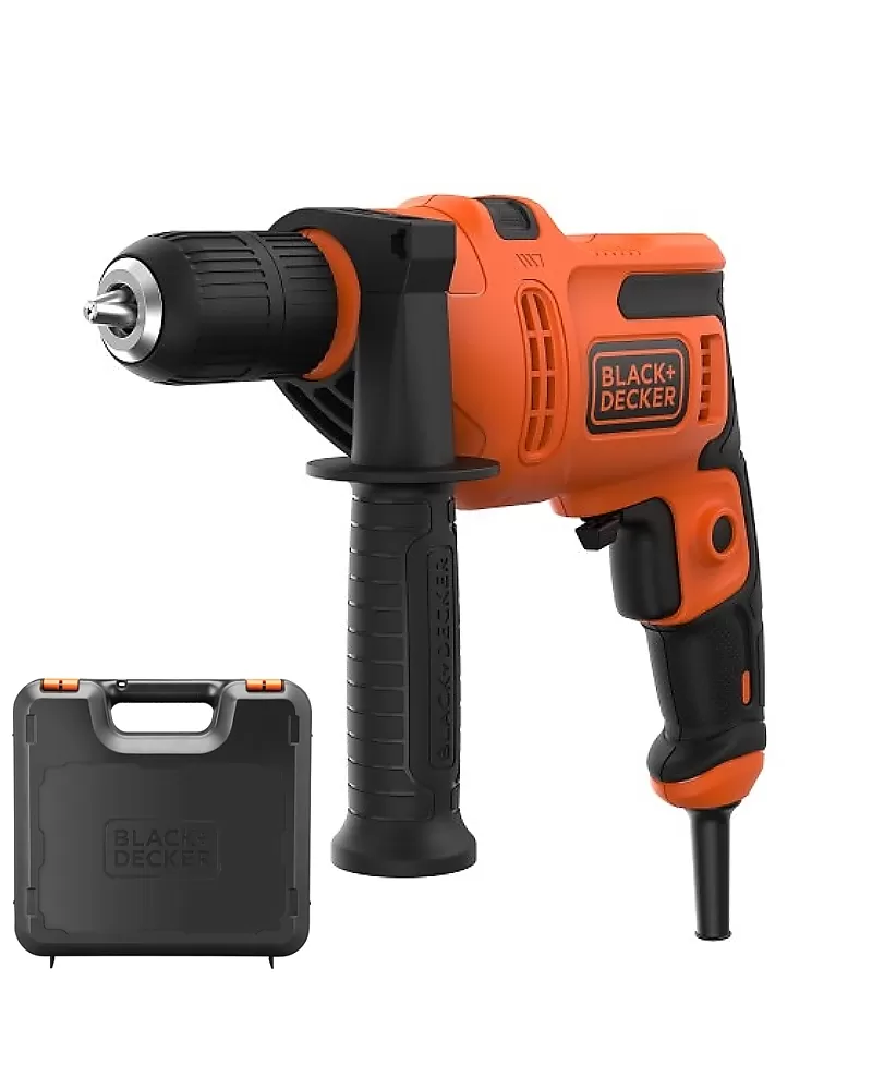 Příklepová vrtačka 500W Black&Decker BEH200K s možností vrtání do dřeva, zdiva i oceli, která najde uplatnění doma i v dílně.