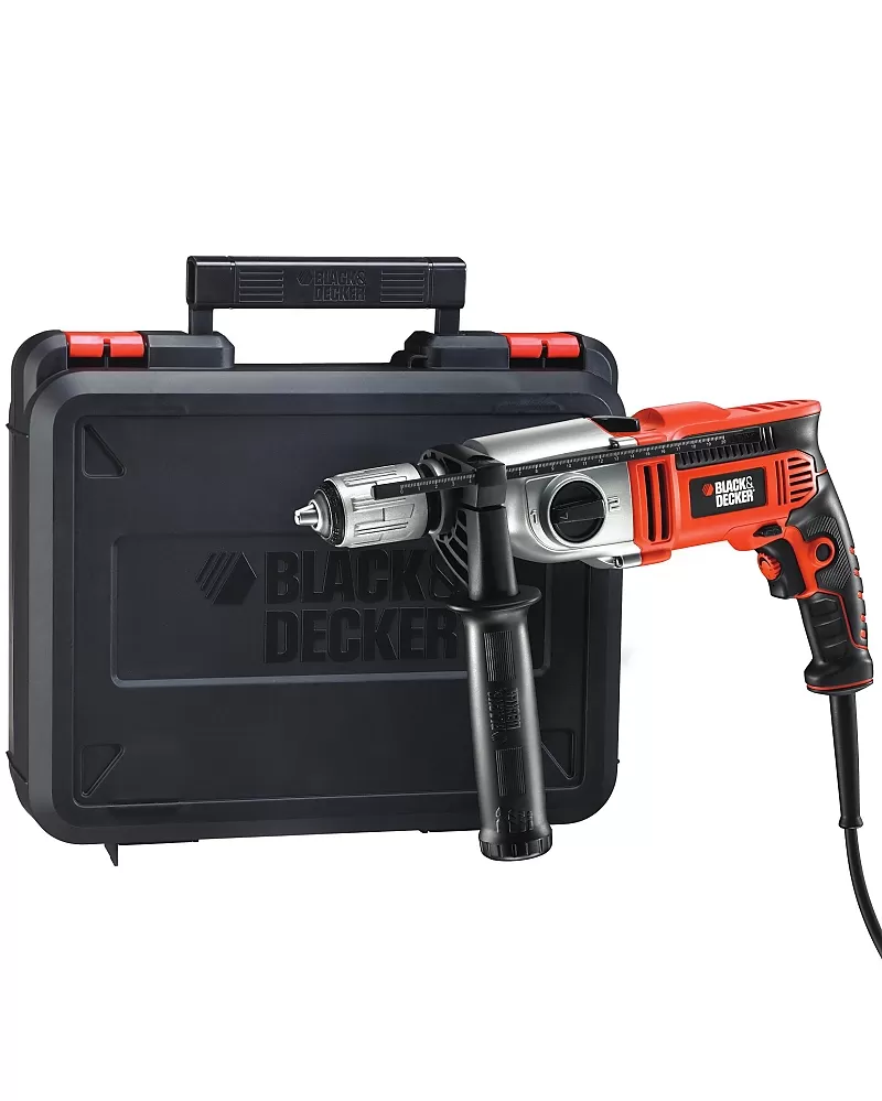 Příklepová vrtačka 910W Black&Decker KR911K s dvourychlostní mechanickou převodovkou nabízející u prvního převodového stupně vysokou hodnotu momentu a u druhého vysoké otáčky.