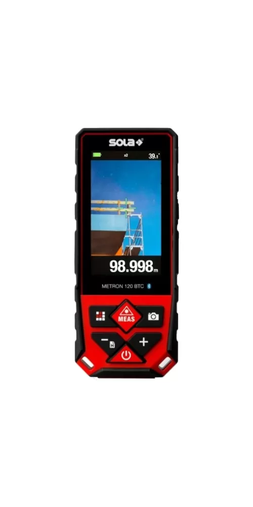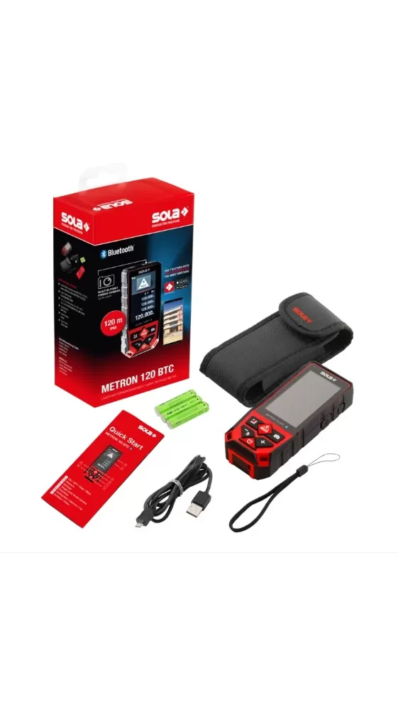 Dálkoměr METRON 120 BTC nabízí rozsáhlé funkce pro přesná měření. Díky dosahu až do 120 m a 17 funkcím měření, mezi nimiž je i měření plochy a objemu a nepřímé měření, má přístroj mnohostranné uplatnění. Pro dlouhé vzdálenosti nebo obtížné vizuální poměry má k dispozici kameru s vyhledáváním cíle s 2násobným a 4násobným zoomem, která zobrazuje naměřenou hodnotu v reálném čase. Naměřené hodnoty je možné komfortně přenášet prostřednictvím Bluetooth přímo na aplikaci SOLA Measures na chytrém telefonu.