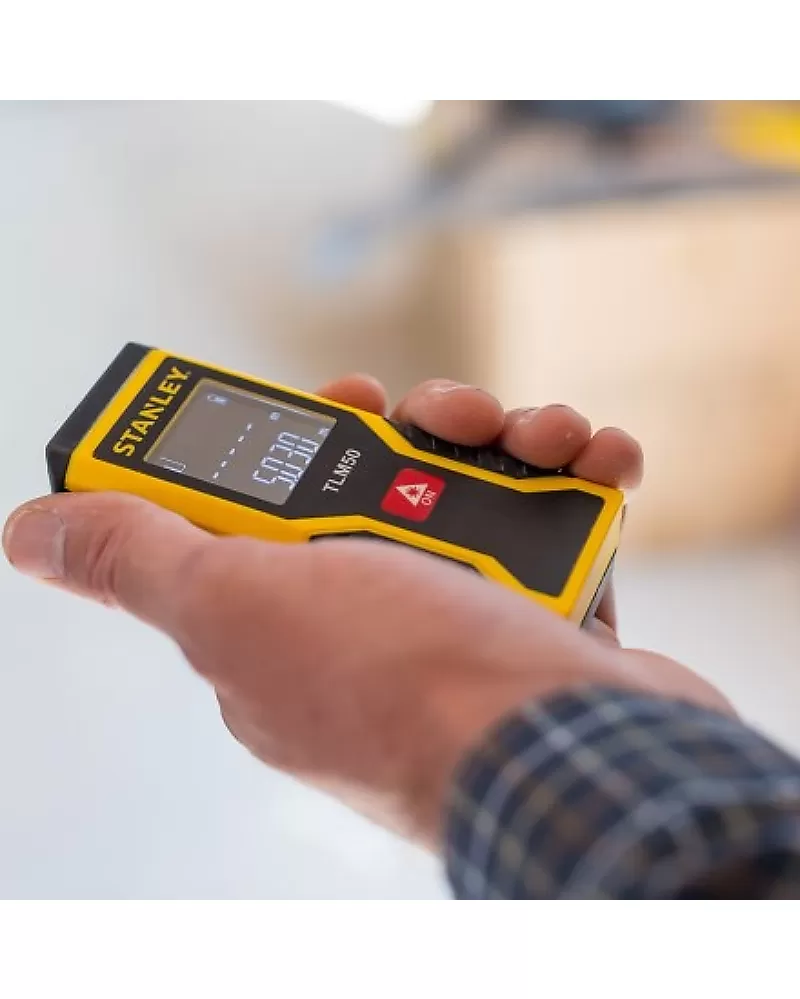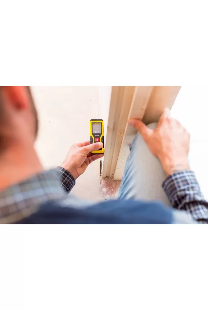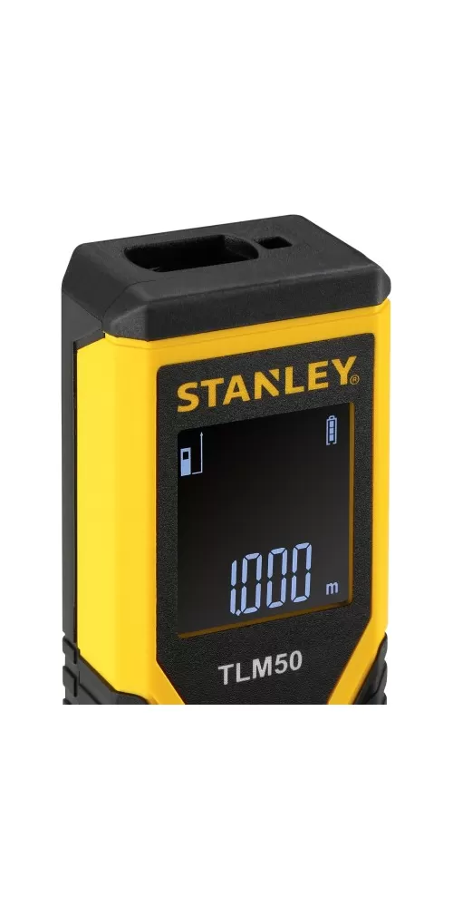 Malý a lehký laserový dálkoměr STANLEY STHT1-77409 s pracovním dosahem měření 15 m a přesností měření ± 3 mm.