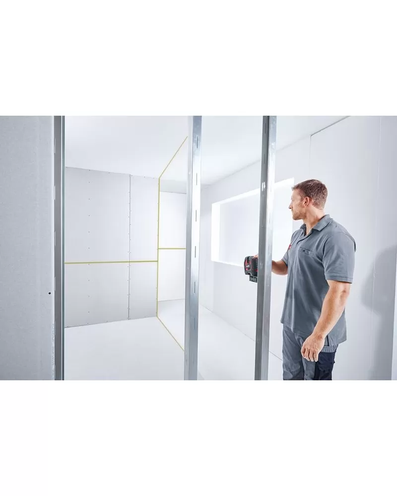 • S jednou horizontální a dvěma vertikálními laserovými linkami v úhlu 90 ° plus olovnice (červený laserový bod), jednotlivě ovladatelné