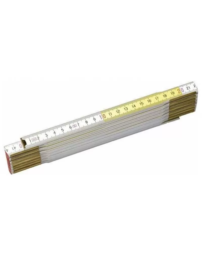 Dřevěný skládací metr bílo-žlutý 2m Stanley 0-35-458 Pružinové ocelové spojky jednotlivých dílů. Skryté nýty a mosazné kování. … Celý popis