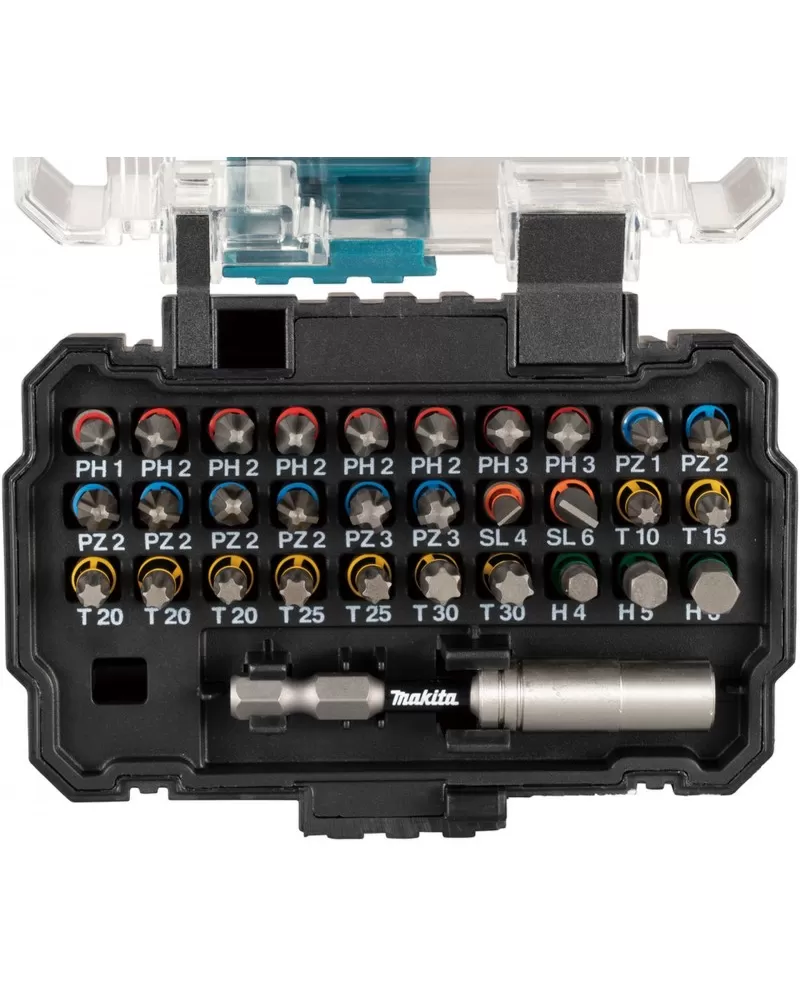 Sada obsahuje: 1/4" torzní bity Impact Black, PH1, 5x PH2, 2x PH3, PZ1, 5x PZ2, 2x PZ3, T10, T15, 3x T20, 2x T2, 2x T30, H4, H5, H6, SL4, SL6. Držák bitů. Dodáváno v plastové krabičce.