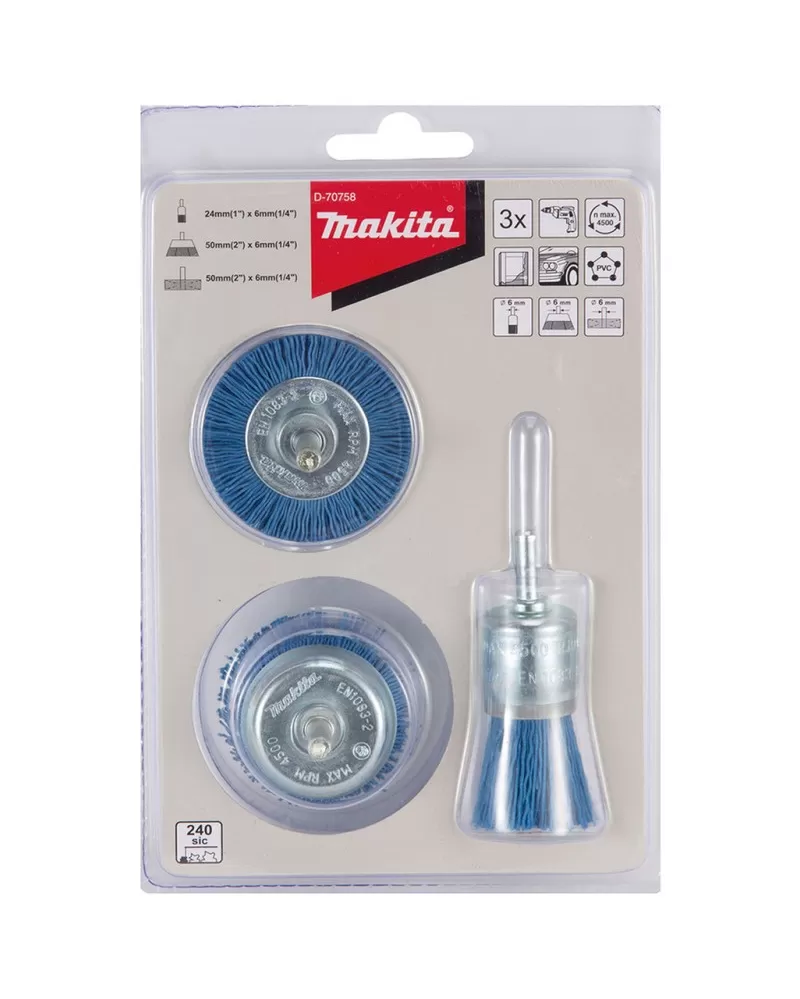 Sada obsahuje 3 nylonové kartáče s hrubostí 240. Průměr hřídele 6 mm. Ideální pro jemné broušení dřeva, plastu nebo kovu při použití vrtacích šroubováků a vrtaček.