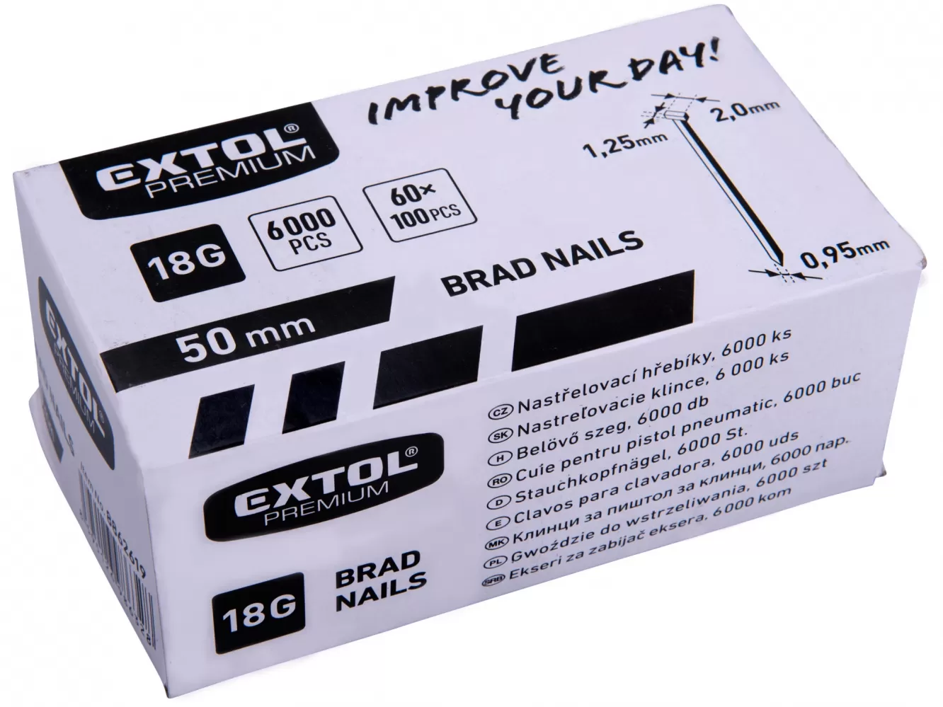 Hřebíky nastřelovací 6000 ks 50 mm EXTOL PREMIUM 8862619 Pro 8891860 a 8865040 50 mm 18G Typ F Hlava 2 mm 1,25 x 0,95 mm Pozinkované Celý popis