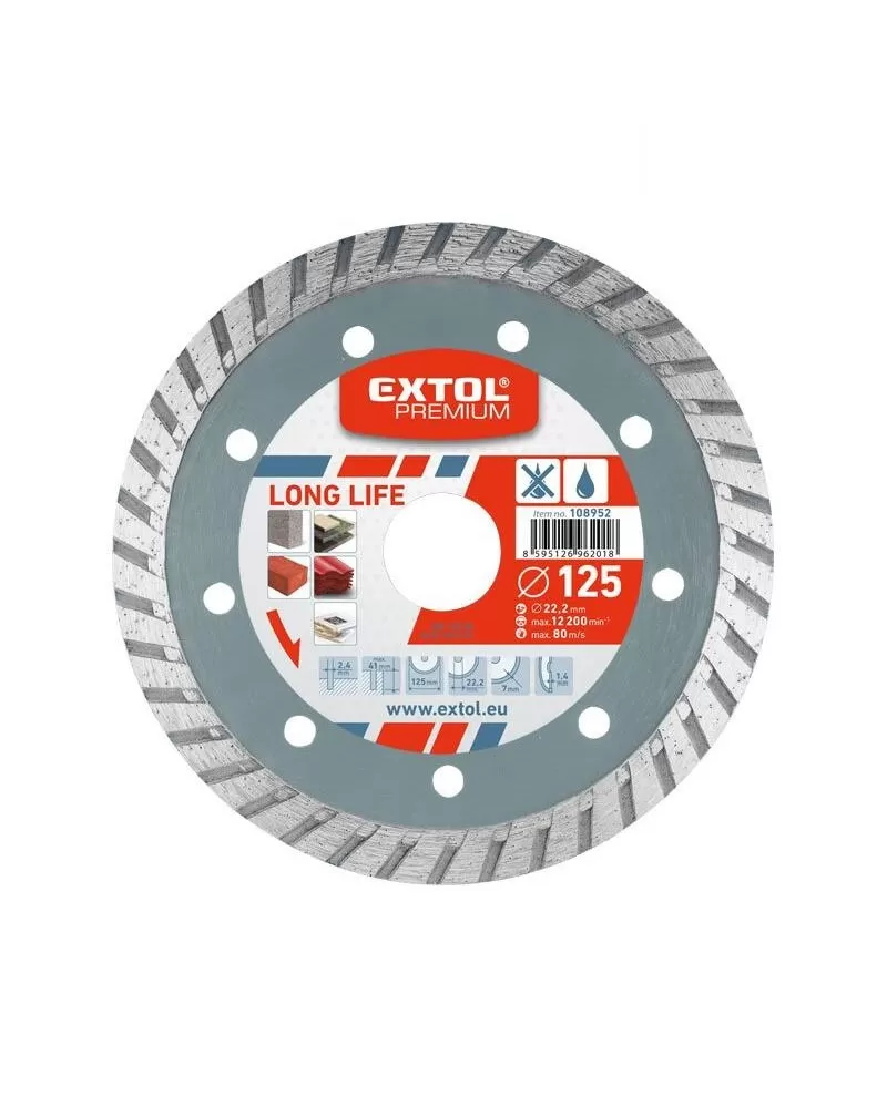 • Řada diamantových řezných kotoučů LONG LIFE s prodlouženou životností pro profesionální a poloprofesionální použití. Díky složení diamantové směsi a výšce segmentu mají kotouče až o 50% větší řezný výkon než ostatní Extol Premium kotouče.