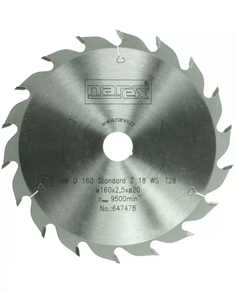 • Technické parametry: 160 mm (průměr), 2.2 mm (šířka karbidových zubů), 1.4 mm (tloušťka těla), 20 mm (otvor), 18 zubů (T).