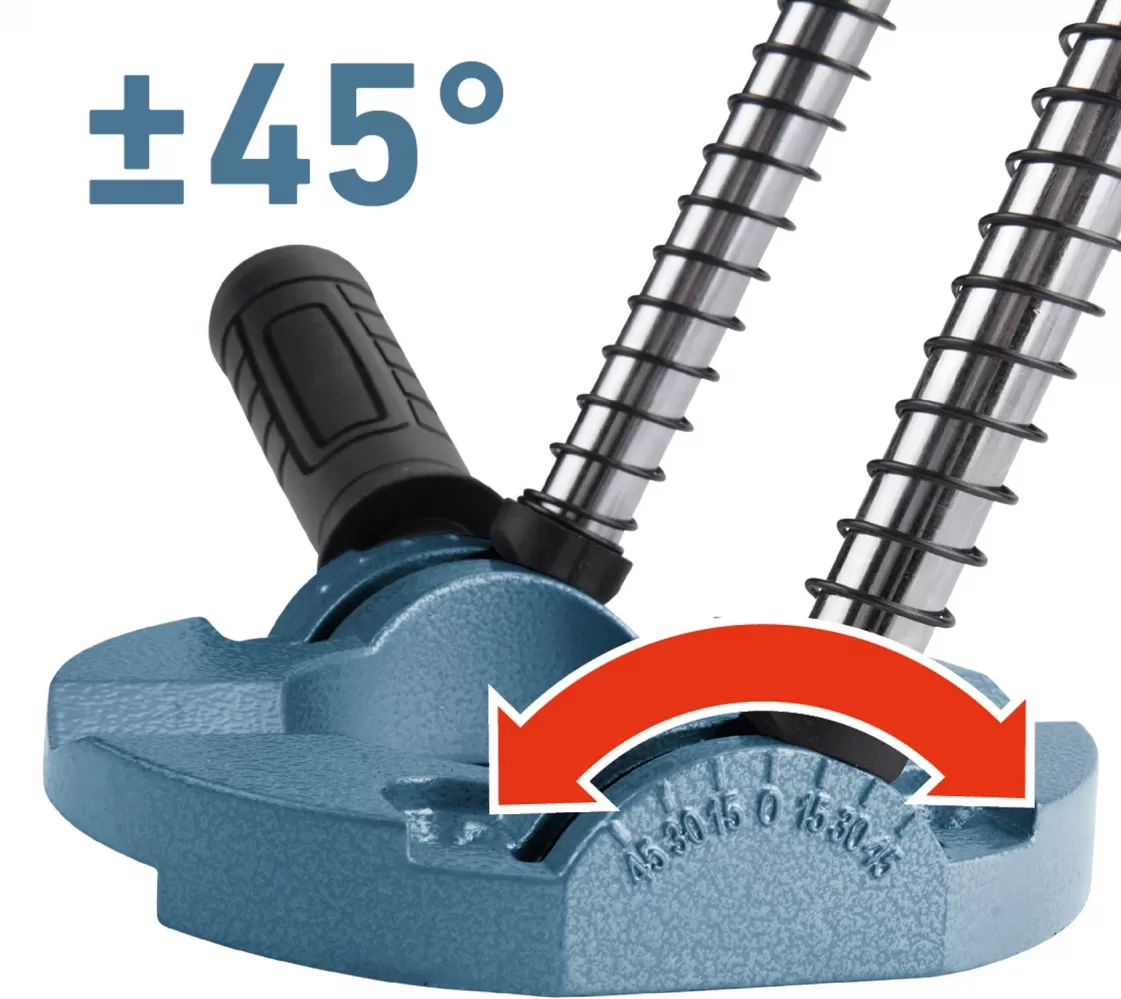 • Stojan lze polohovat na vrtání pod úhlem v rozmezí +- 45° od vertikální osy kolmé k základně