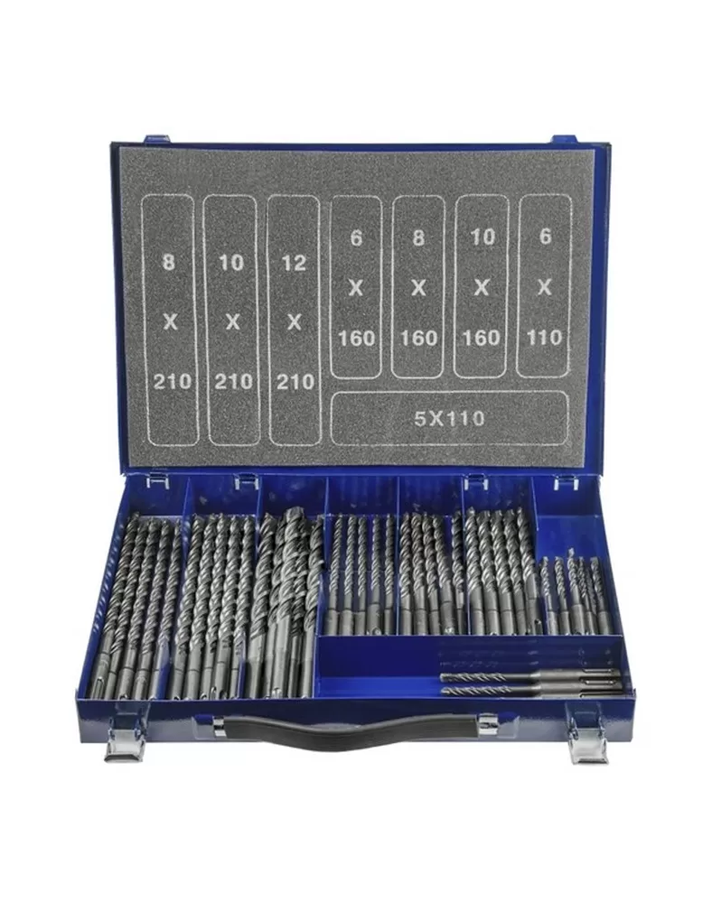 Sada 40 kusů vrtáků SDS-plus s dvoubřitem - 8 nejpoužívanějších rozměrů po 5 kusech od každého. Uloženo v kovovém kufru.
