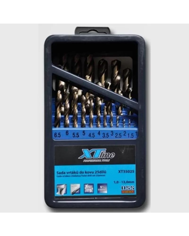 • Sada 25 vrrtáků XTline do kovu vyrobené z rychlořezné oceli HSS s příměsí 5 % kobaltu, který zvyšuje tvrdost vrtáku a prodlužuje jeho životnost