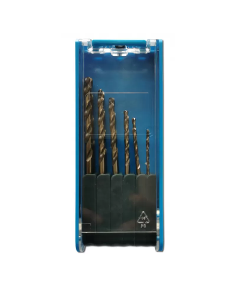 Sada 13 vrtáků do kovu vyrobených z rychlořezné oceli HSS s příměsí 5% kobaltu, která zvyšuje tvrdost vrtáků a prodlužuje jejich životnost. Dělená špička broušená pod úhlem 135° vyžaduje menší tlak při vrtání a zabraňuje pohybu vrtáku po povrchu. Vhodné pro vrtání oceli, nerezové oceli, litiny a jiných kovů. Upnutí vrtáku na válcovou stopku. Vrtáky lze opětovně brousit. Sada vrtáků jsou uloženy v plastové kazetě s pogumovanými rohy. Hlavní přednost vrtáku: Špička vrtáku SPLIT-POINT 135° pro dokonalé vystředění a menší tlak při vrtání - vybroušená šroubovice rychle odebírá vrtaný materiál a ocel HSS+ kobalt pro vrtání nerez oceli.