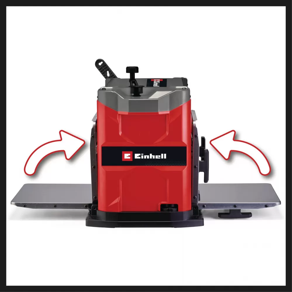 Einhell TE-SP 330 Stacionární hoblík je velmi pevná, stabilní a torzně tuhá čtyřsloupcová konstrukce s výkonem 1 800 wattů a otáčkami nožového hřídele 10 000 otáček za minutu. Díky svému vysokému výkonu udržuje stroj neustále vysokou rychlost otáček hřídele, čímž zajišťuje optimální výsledky hoblování pro všechny typy dřeva. Hoblík je vybaven dvěma ostrými oboustrannými hoblovacími noži v kvalitě HSS, zámkem hoblovací jednotky a robustním odnímatelným stolem z nerezové oceli, díky čemuž vždy schopen zajistit optimální výsledky při hoblování na tloušť s rychlostí vkládání 8,4 m /min. Stabilní sklopný stůl je lehce nastavitelný. Hoblovka je vybavena ruční klikou pro plynulé nastavení tloušťky hoblování se stupnicí. Nastavený úběr hoblovky do max. 3 mm lze kontrolovat pomocí snímače s displejem. Odsávací adaptér Ø 100 mm pro připojení k velkým odsávacím systémům zajišťuje čisté pracoviště.