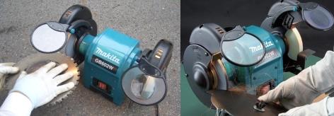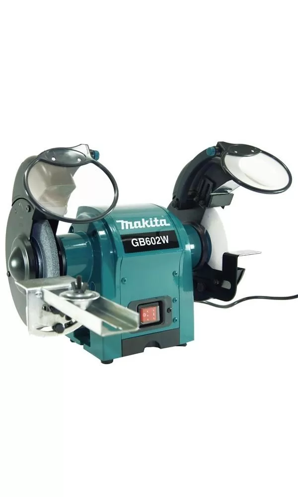 Dvoukotoučová bruska 150mm s držákem Makita GB602W, součástí dodávky je držák na broušení pilových kotoučů.