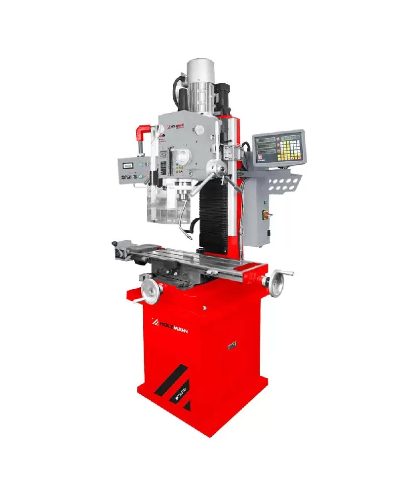 Frézka HOLZMANN ZX7045PRO s bohatým příslušenstvím, jako je podvozek, 3osý digitální display, čerpadlo a nádrž na chladící kapalinu, elektrické nastavení výšky frézovací hlavy, podavač pro osu X a ovládací panel, je ideální pro vaši dílnu na zpracování kovu a zajišťuje přesné a jednoduché frézování a vrtání.