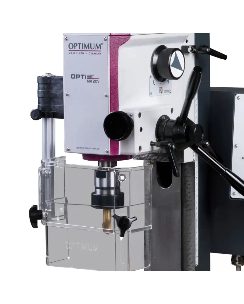 Stolní frézka Optimum OPTImill MH 20 V Frézovací hlava sklopná o ±90° umožňuje frézování a vrtání pod různým úhlem Stranově přestavitelný… Celý popis