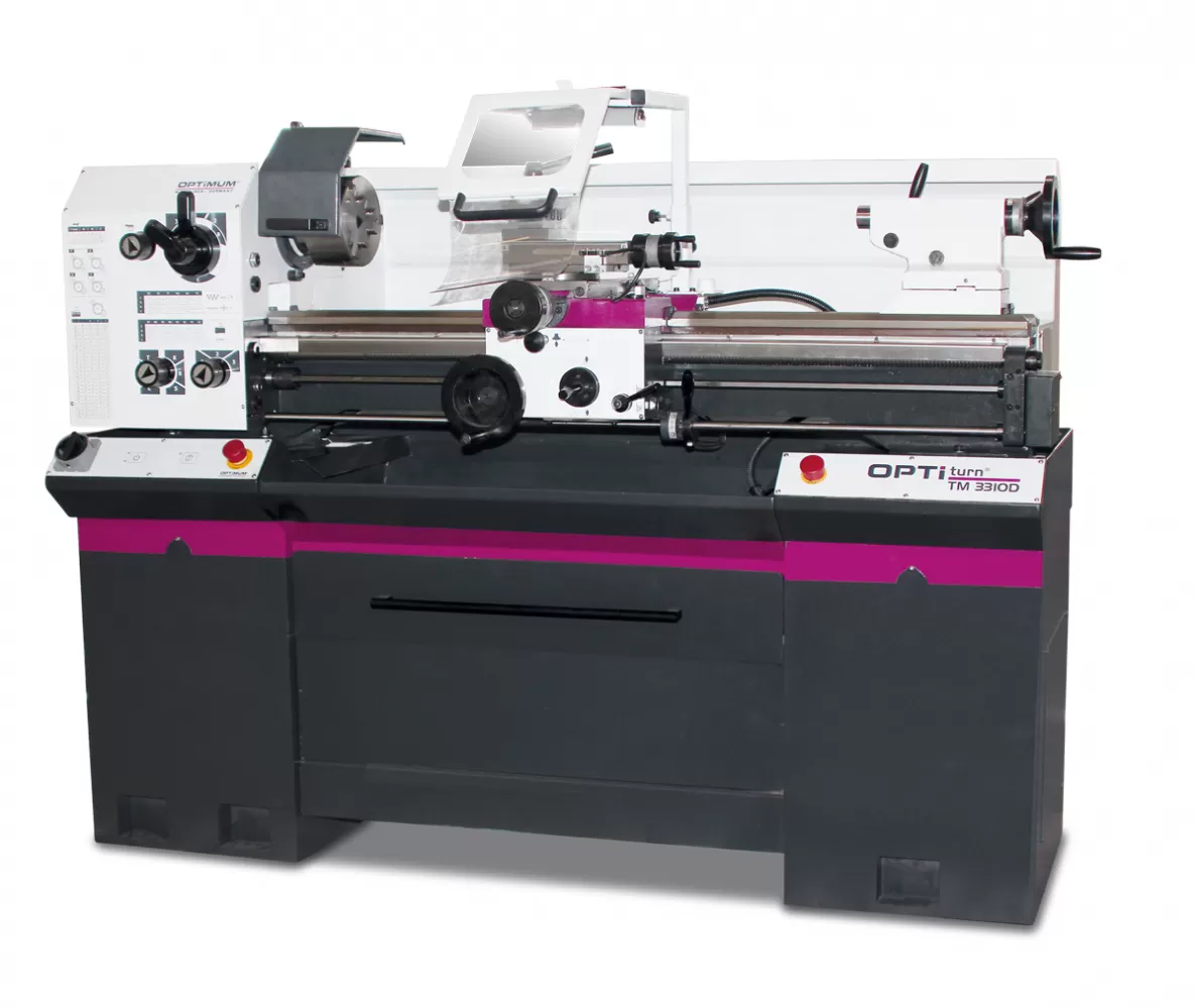 Plně vybavený soustruh s vodicím a tažným šroubem. Volitelně s plynulou regulací otáček pomocí frekvenčního měniče Lenze.
