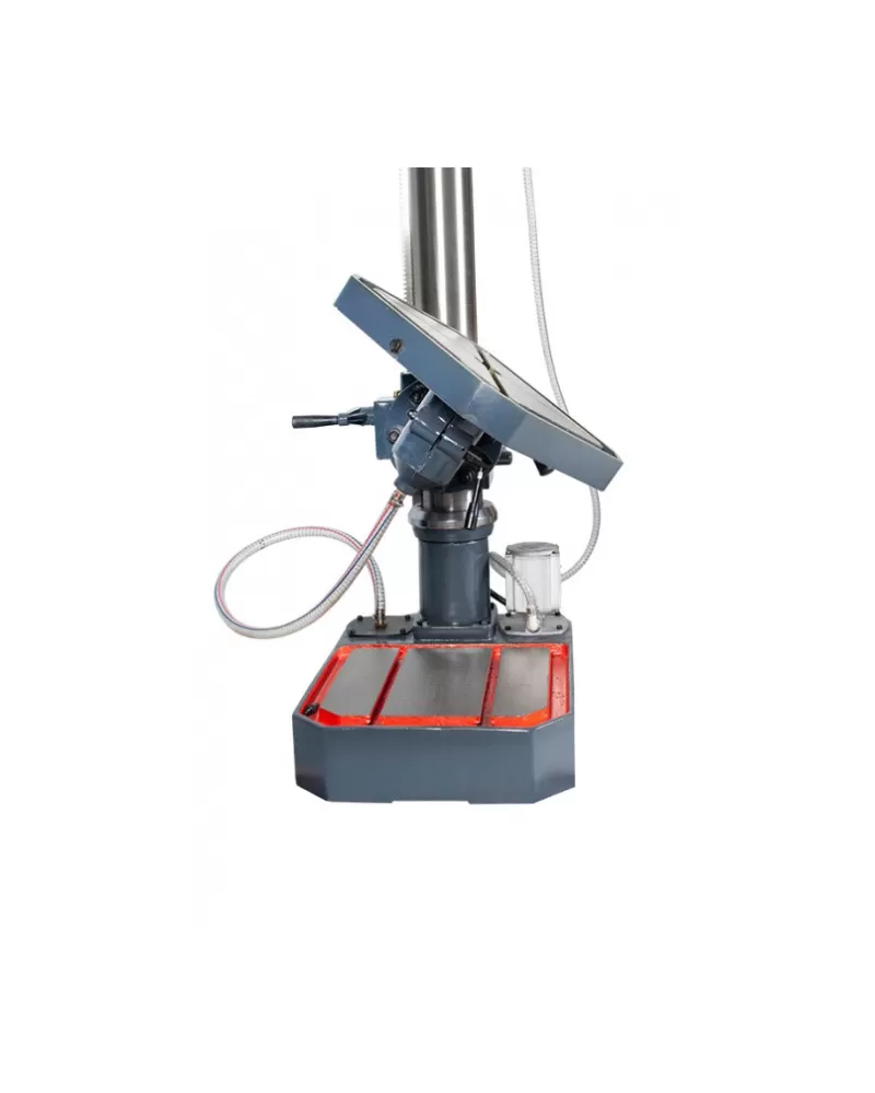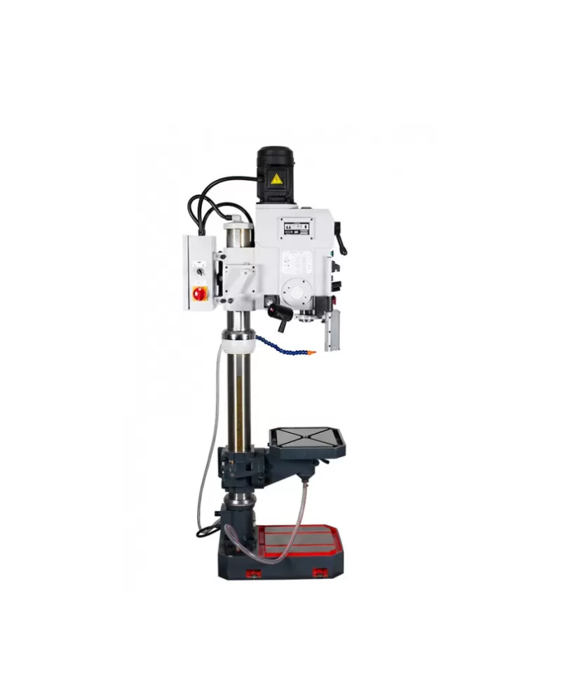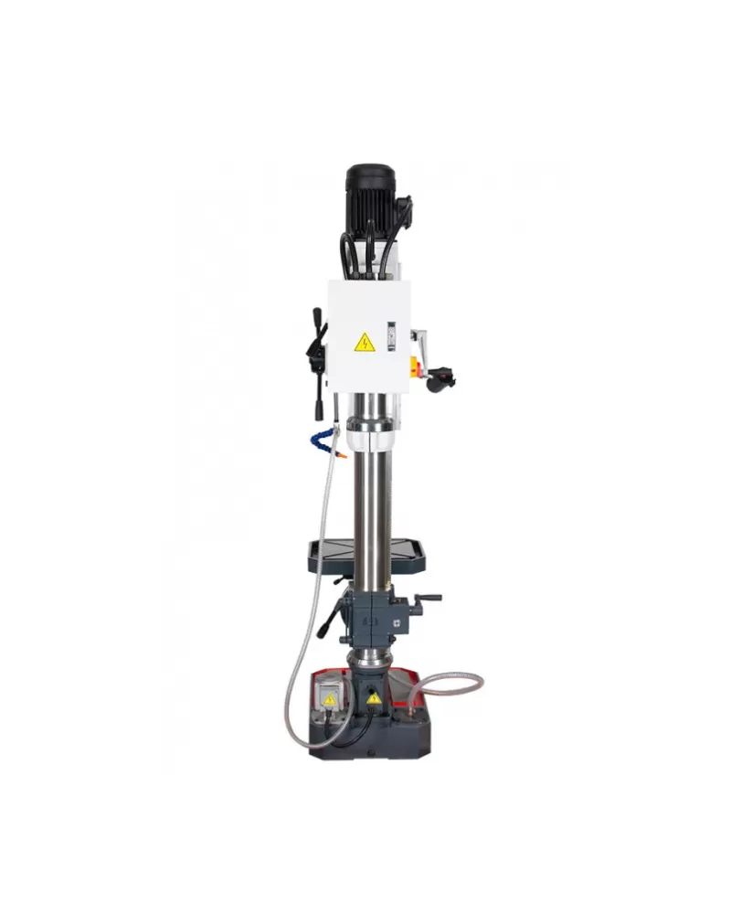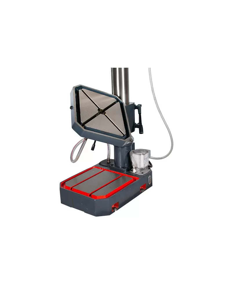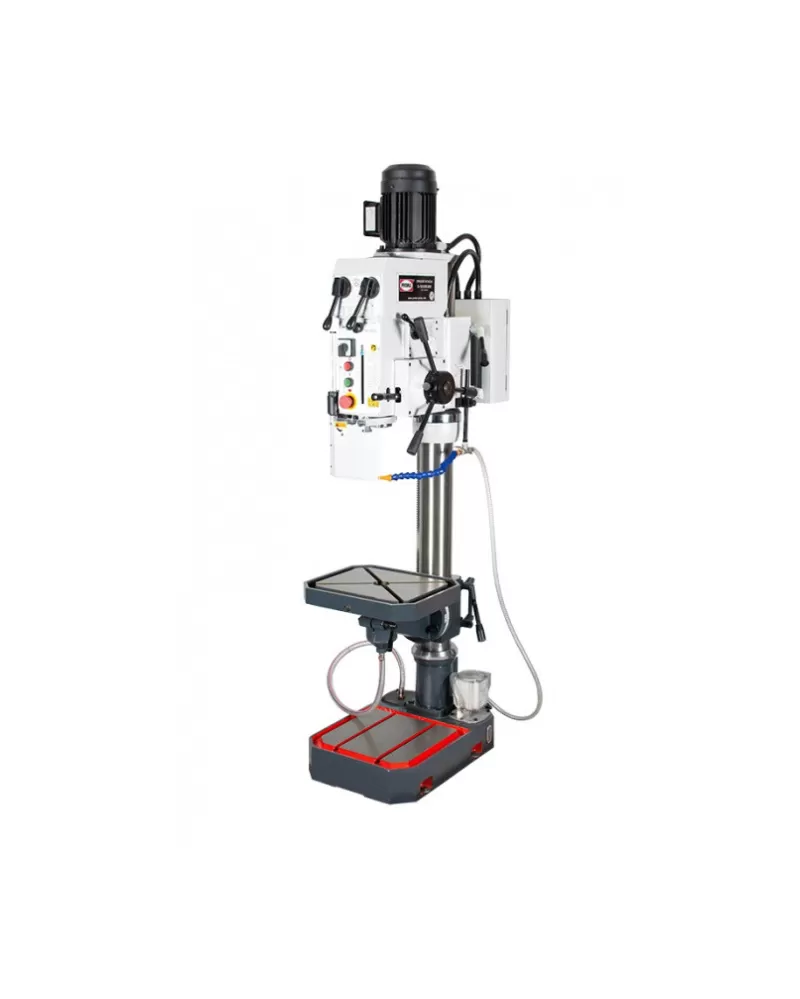 Průmyslová vrtačka s autoposuvem pinoly PROMA S-1830B/400 využitelná pro mnohostranné použití v těžkém a masivním litinovém provedení s pracovním stolem s manuálním i strojním posuvem a naklápěcí vrtací hlavou.