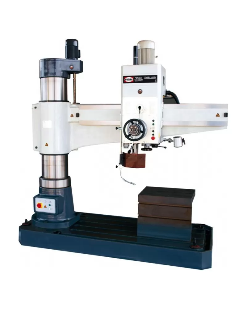 Radiální vrtačka PROMA RV-40E využitelná pro mnohostranné použití v těžkém a masivním litinovém provedení s pracovním stolem s manuálním i strojním posuvem a naklápěcí vrtací hlavou.