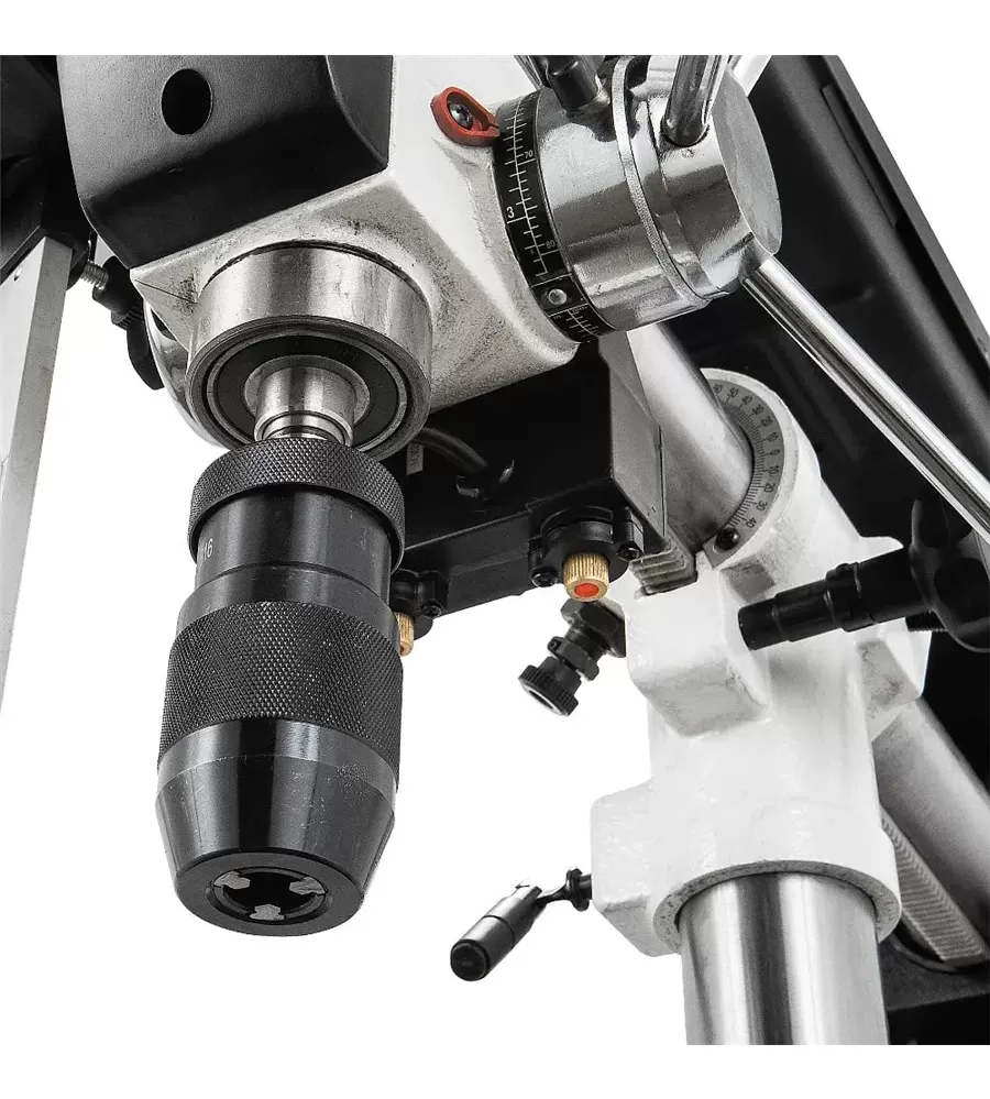 • Vrtací vřeteno se zdvihem 80 mm je poháněné řemenem s možností volby pěti stupňů otáček od 500 do 2500 ot./min