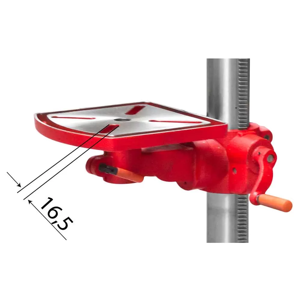 Vrtačka má hliníkový motor s IP54, stabilní sloupek s broušeným povrchem a otočný stůl výškově přestavitelný pomocí ozubeného hřebenu.