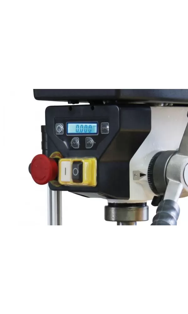 Stolní vrtačka s řemenovým pohonem a digitálním ukazatelem otáček a vrtací hloubky na vrtací hlavě.