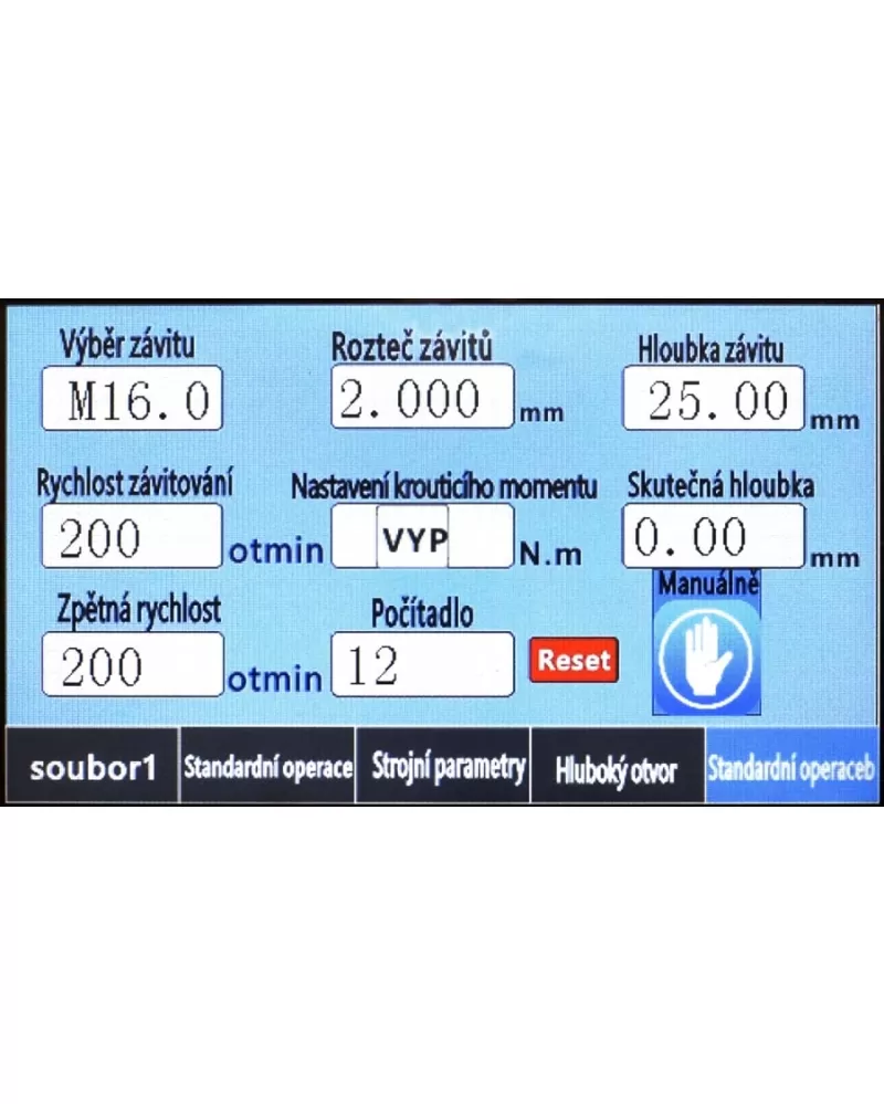 • Nastavení velikosti závitu, otáček, stoupání, hloubky řezu pomocí dotykového displeje