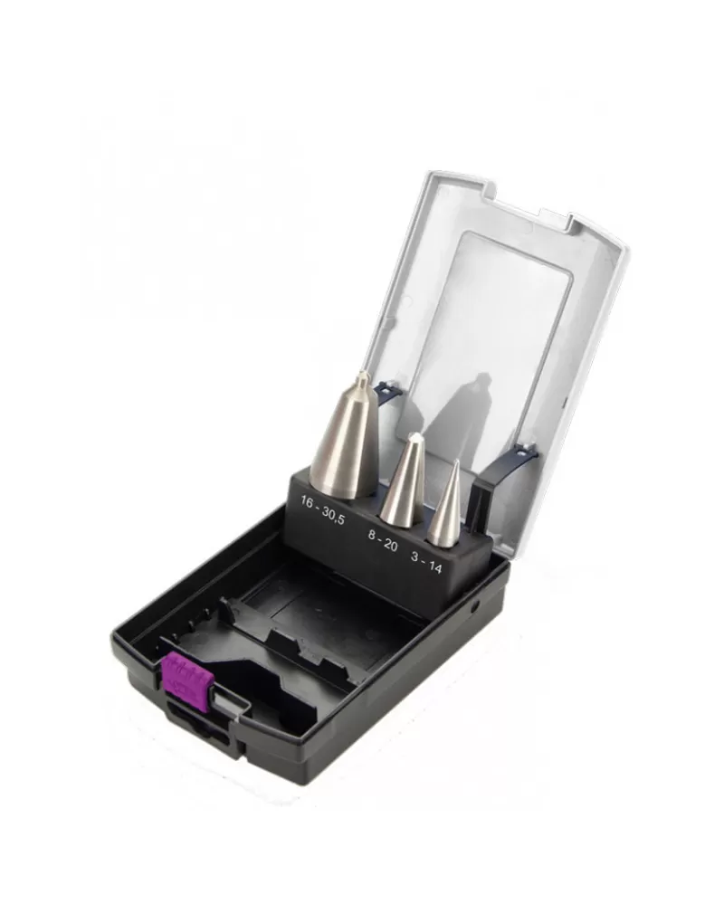 • Sada kuželových vrtáků do plechu 3 – 14 mm / 8 – 20 mm / 16 – 30,5 mm.