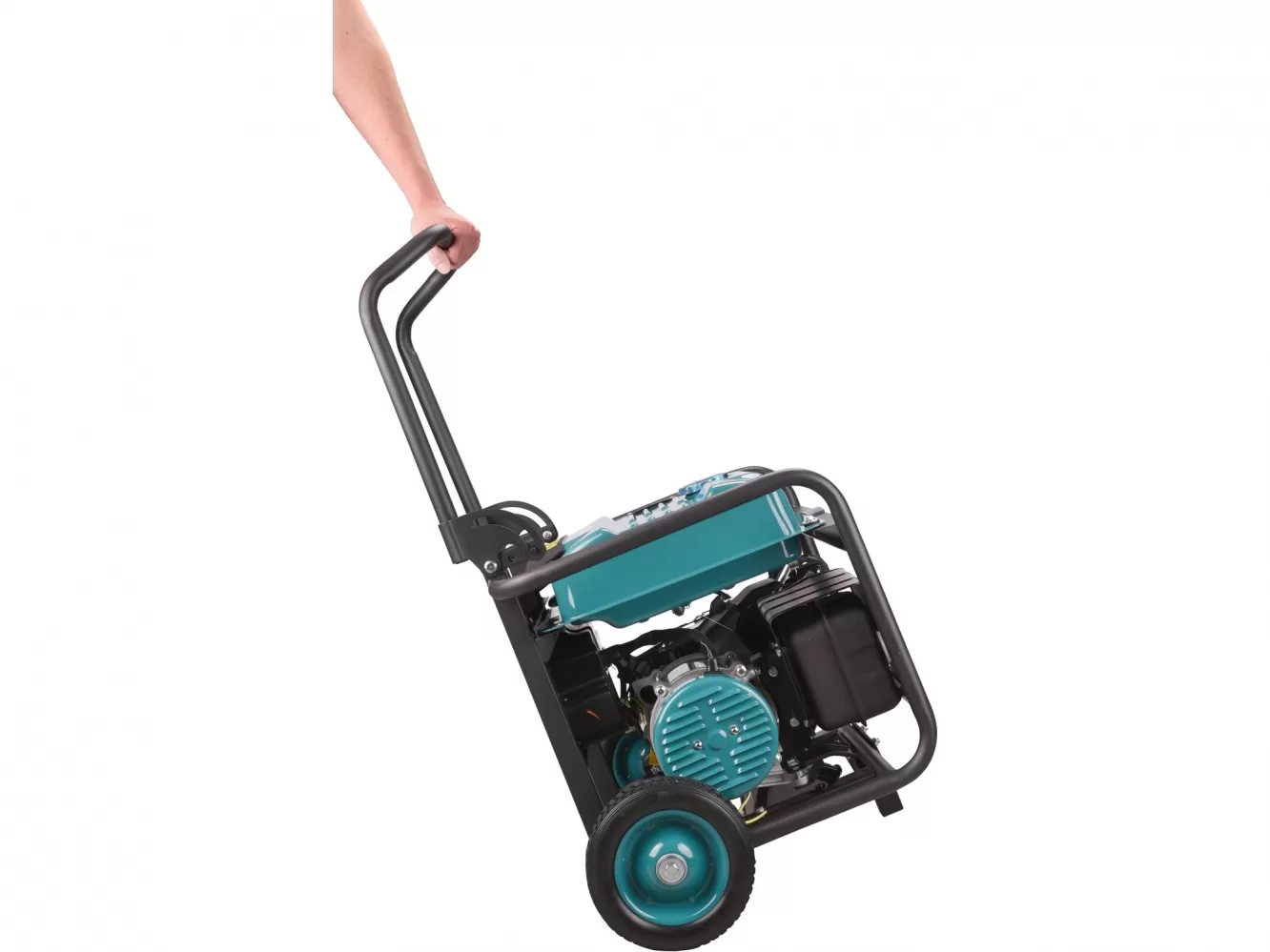 • Sklápacia rukoväť a pevné gumené kolieska, ktoré sú súčasťou dodávky, umožňujú ľahkú prepravu elektrocentrály na miesto potreby podobne ako cestovnú batožinu s madlom a kolieskami