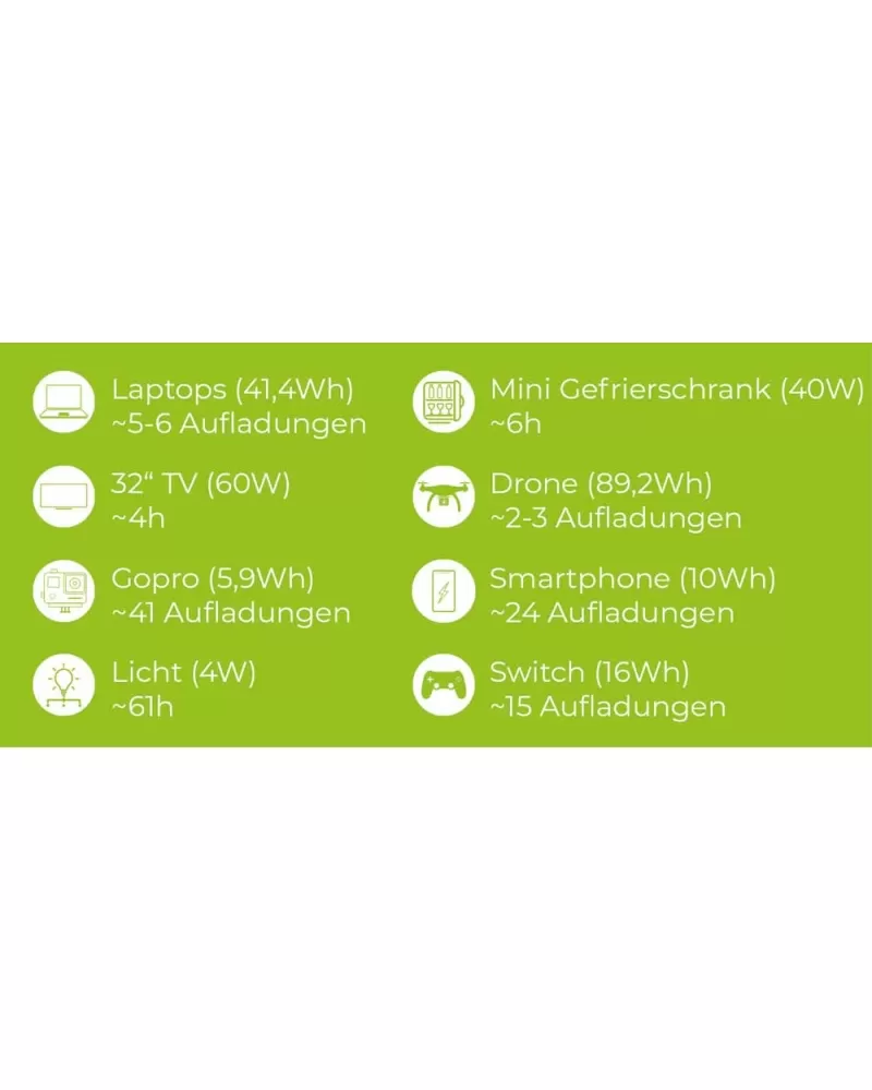 • Včetně síťové nabíječky 150 W, nabíjecího kabelu do auta (zapalovač cigaret), kabel MC4 (pro solární panel),