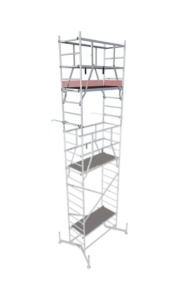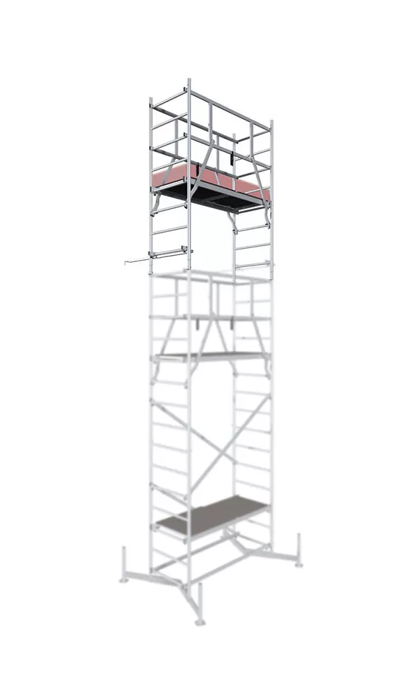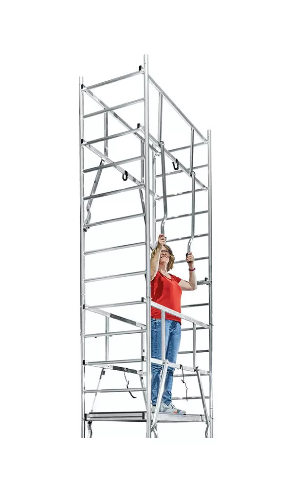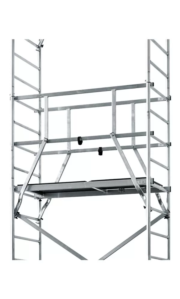 • Rozšíření základní sestavy a první nástavby na pracovní výšku do 7 m ( pojízdné hliníkové lešení třídy lešení 3, rozměr podlážky 1,50 x 0,60 m, maximální přípustné rovnoměrně rozdělené zatížení podlážky 180 kg ).