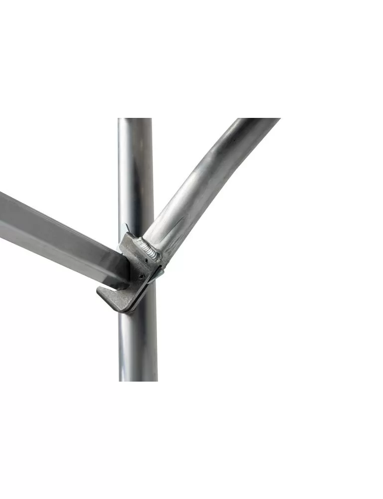 • Upevnění úhlopříčných výztuh, zábradelních tyčí i podlážek je řešeno patentovaným tvarovým a současně svěrným spojením. Zajištění spoje se provádí jednoduše "zaklepnutím" tvarové západky kladívkem. Uvolnění spoje pak jednoduchým "vyklepnutím".